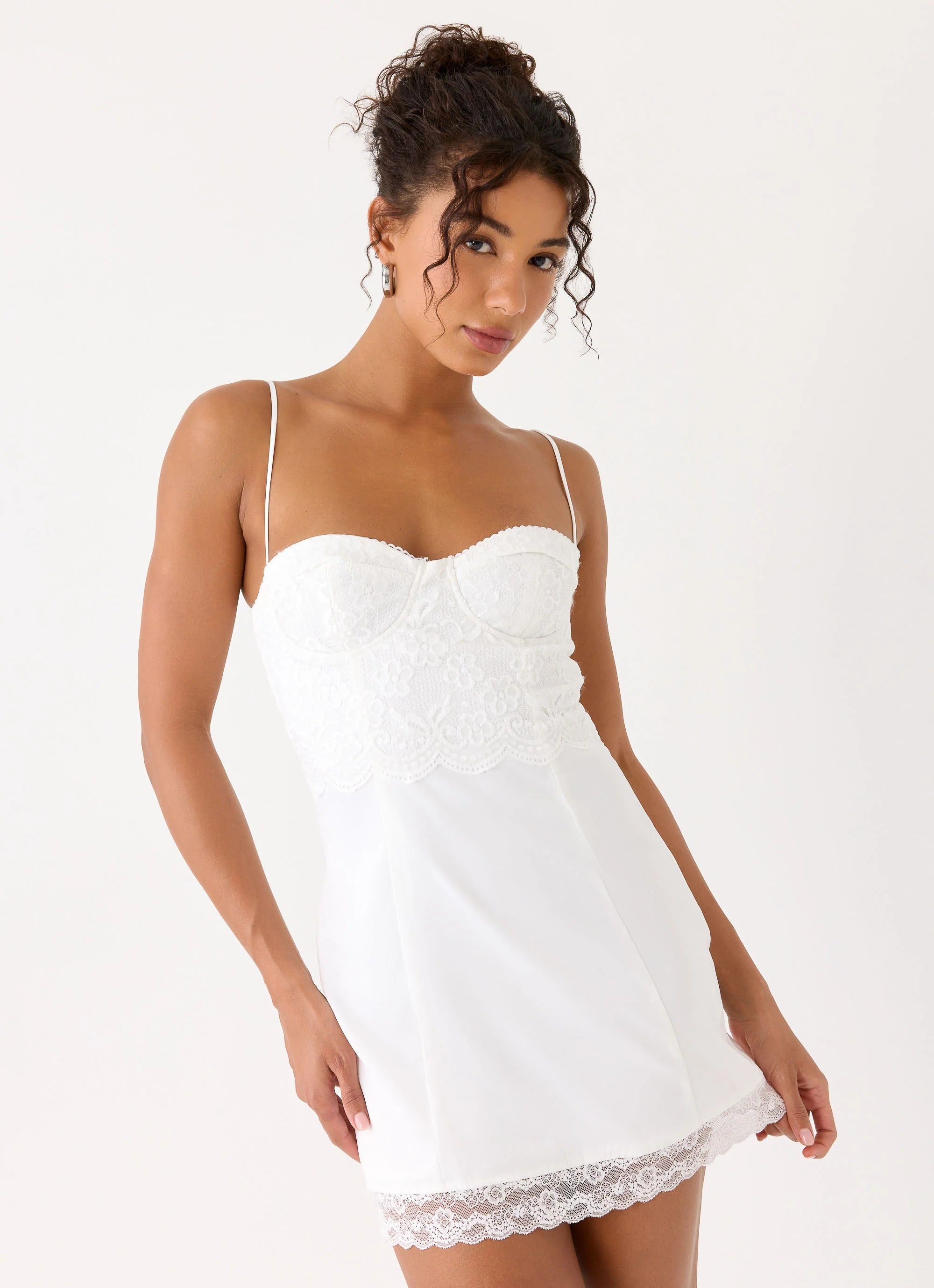 The Aloura Lace Mini Dress was made for balmy nights and after-dark moments. Cut in a sculpting bustier silhouette with delicate thin straps, it skims the body before falling to a lace-trimmed hem. Flirty, feminine and undeniably confident, this mini is your golden