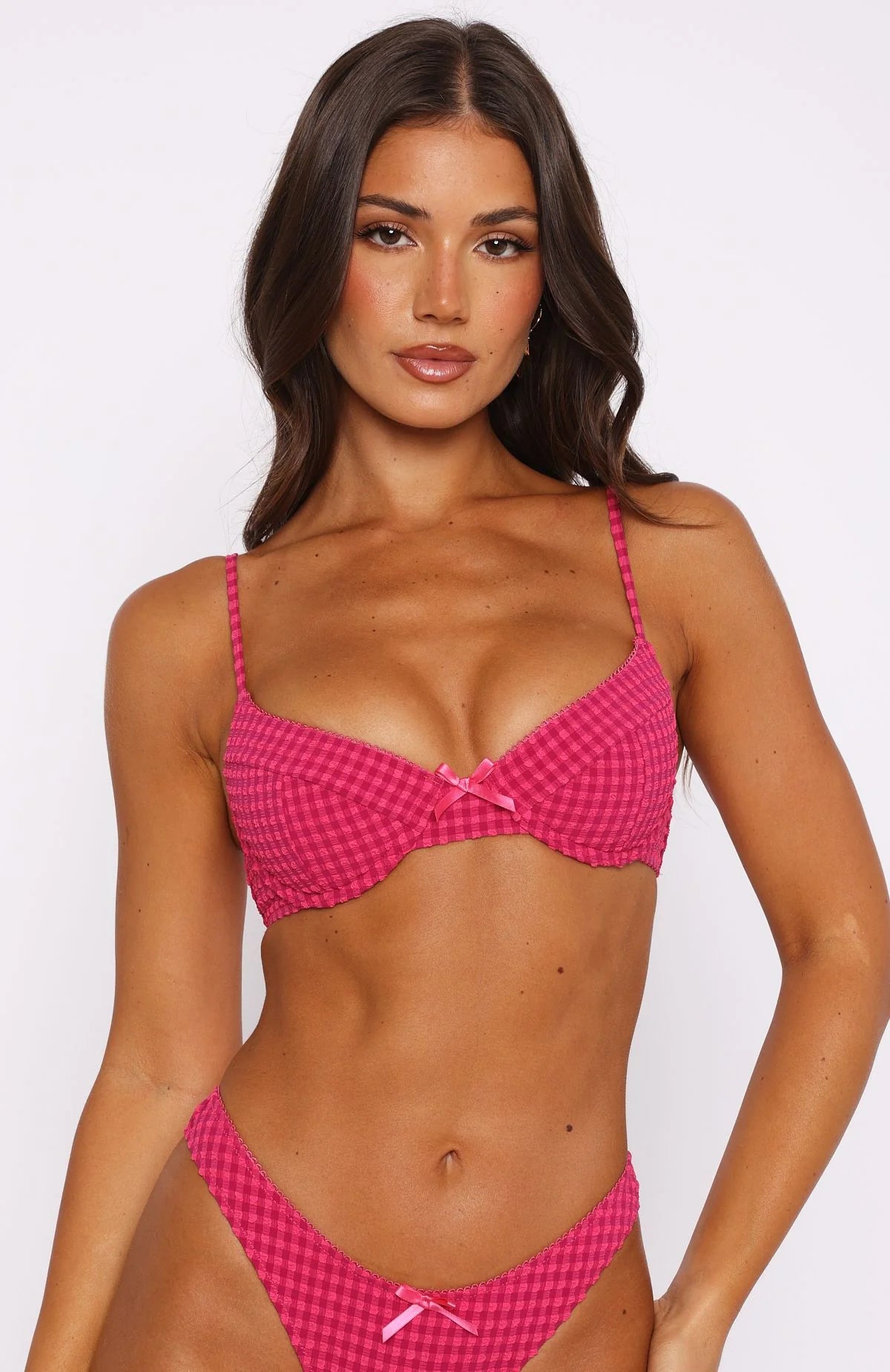 Effortlessly round out your swimwear collection with the Beachside Bikini Top Fuchsia Gingham. This lined underwire bikini top has moulded cups with non removable padding, adjustable thin straps, gold metal closure at back, bust support and ruched fabric. To compliment the bikini top pair with any of our Bikini Bottoms in Fuchsia Gingham.
