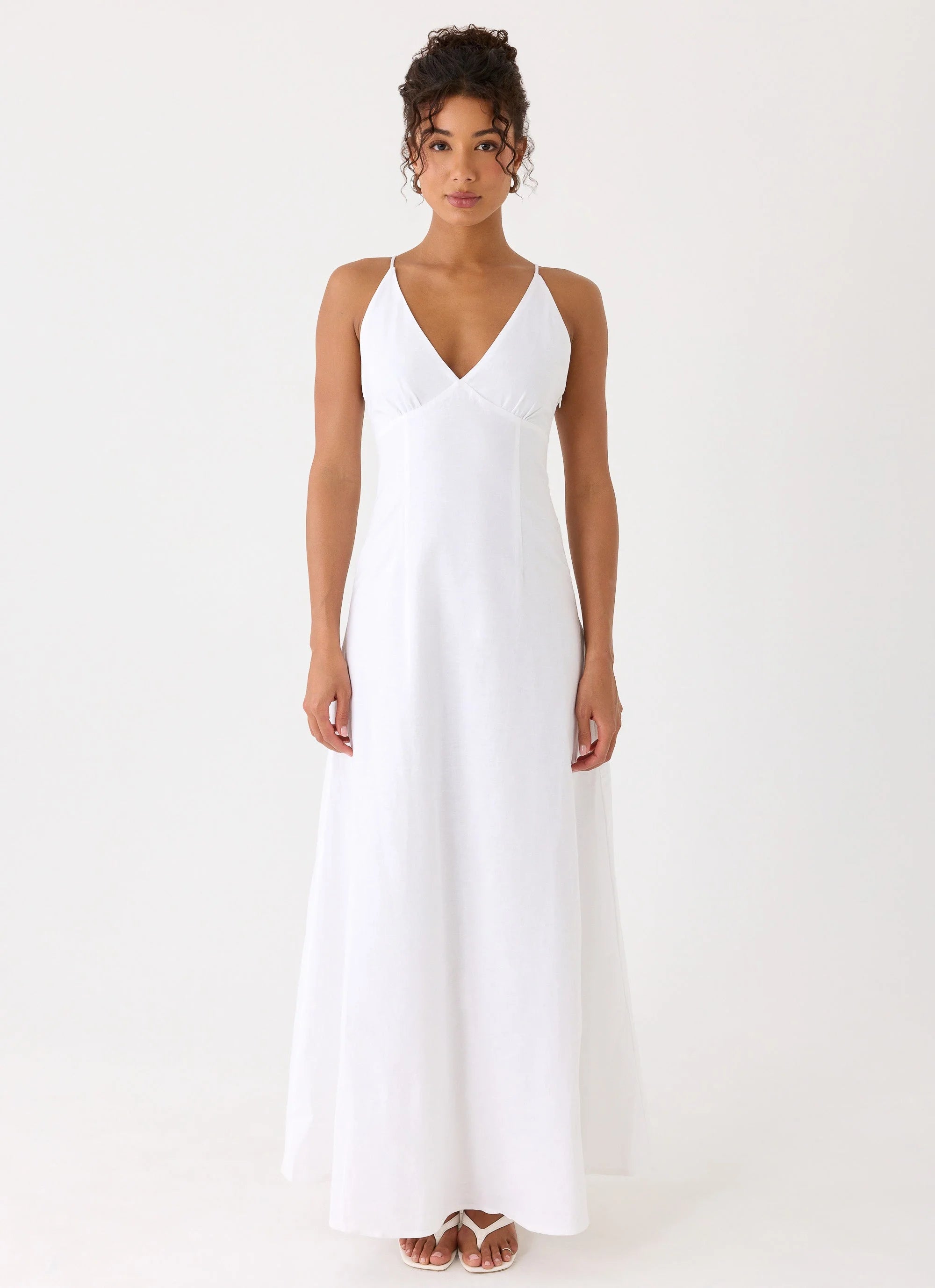 The Calianna Linen Maxi Dress is made for sun-soaked days that flow into balmy, golden-hour evenings. Featuring a low V neckline and adjustable straps, this maxi-length silhouette skims the body with effortless elegance, finished with a side invisible zipper, hook and eye closure, and full lining.