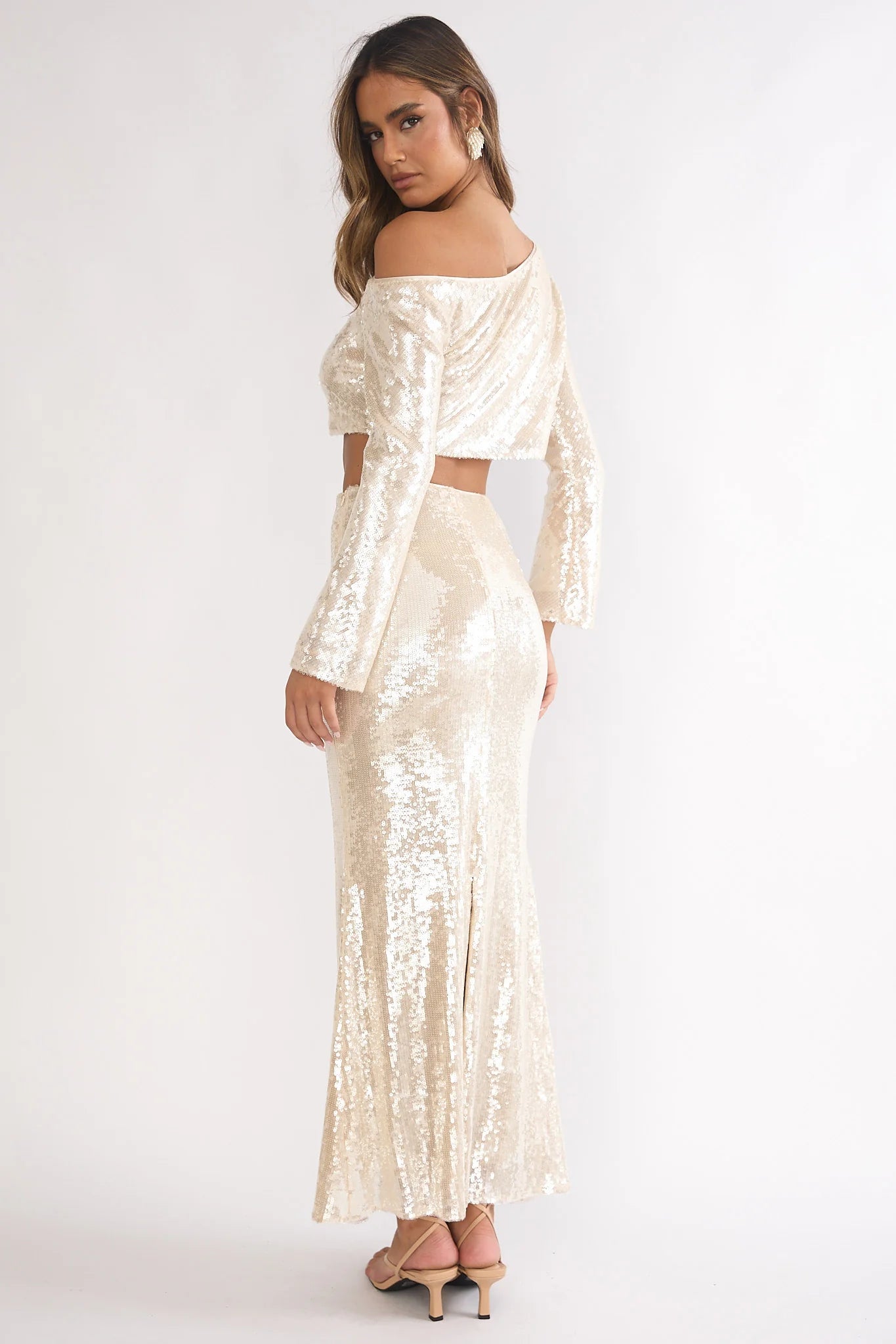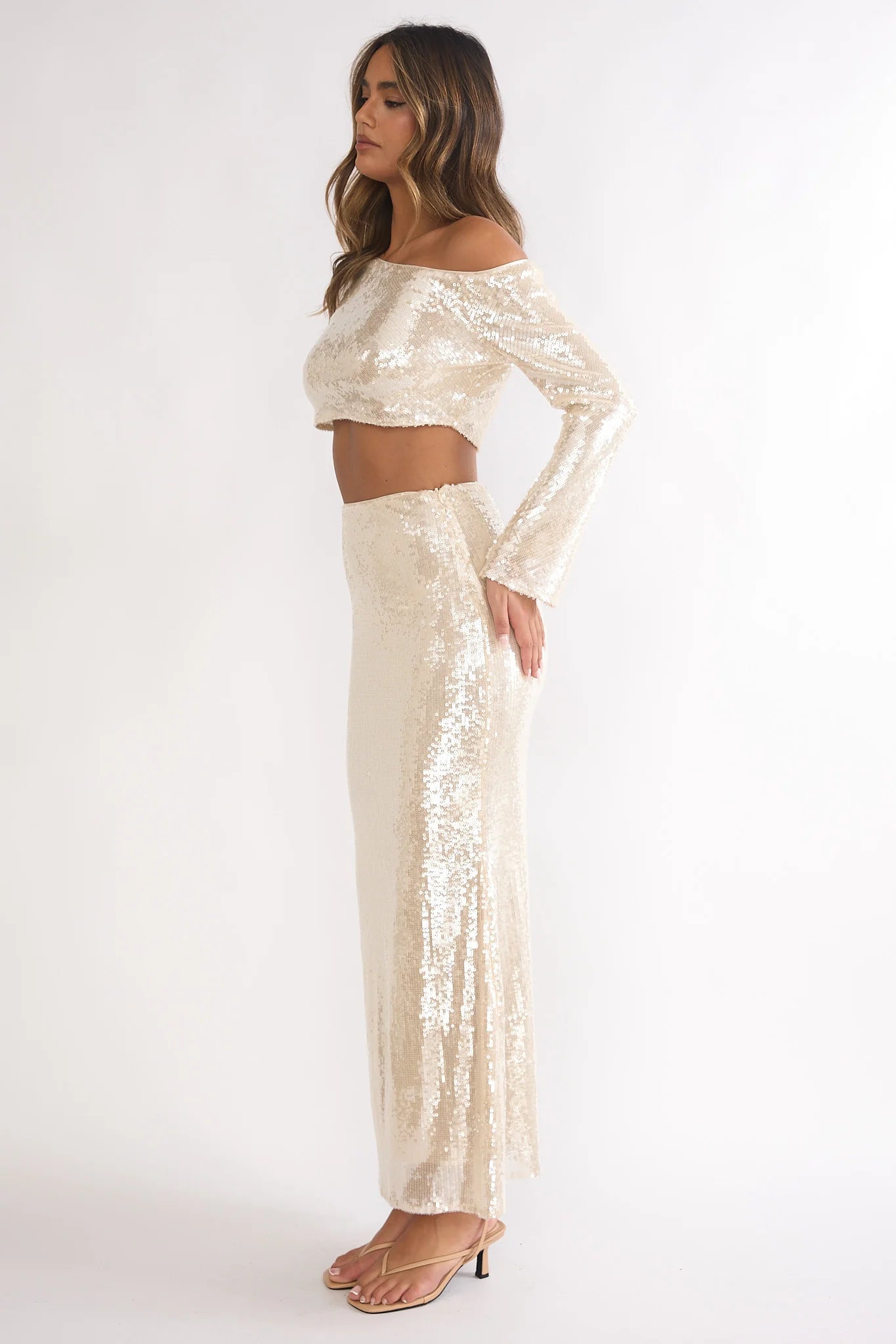 Turn heads in the chic Crystalline maxi skirt. We are obsessed with its stunning sequins throughout. Perfect for a glam holiday party teamed its matching crop top, a faux fur jacket and heels for an It Girl look.