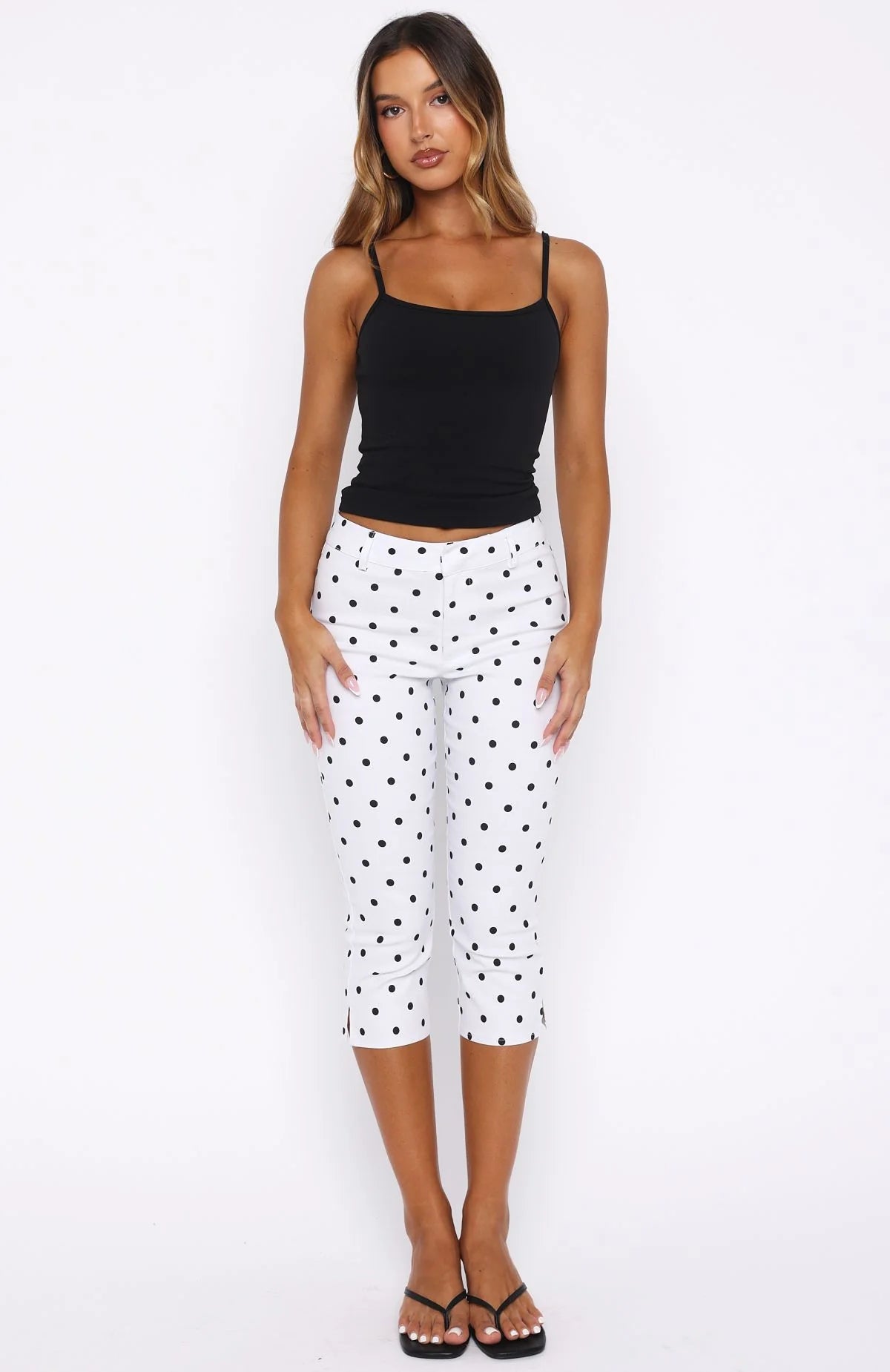 The Day For It Capri Pants White/Black Polka Dot are your next staple pant for the Summer. Features front zipper, button and clasp closure, belt holes, faux back pockets and side split on leg hemline. Complete the look with a White Fox basic tank, sandals and gold accessories for a causal summers day fit!