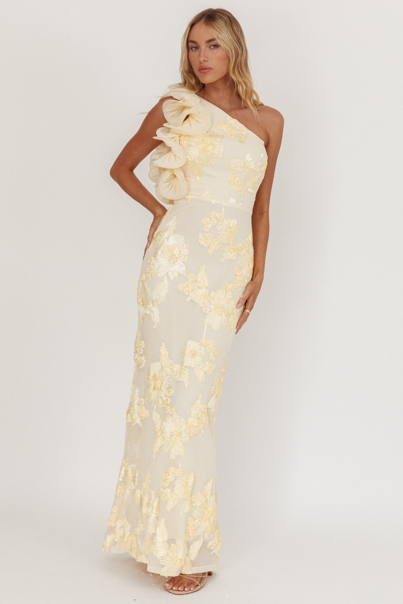 Make heads turn in our gorgeous Deanna maxi dress. It features a one-shoulder style with pretty ruffle detail. Wear it to a red carpet event or special birthday soiree teamed with strappy, nude heels and a clutch for an unforgettable look.