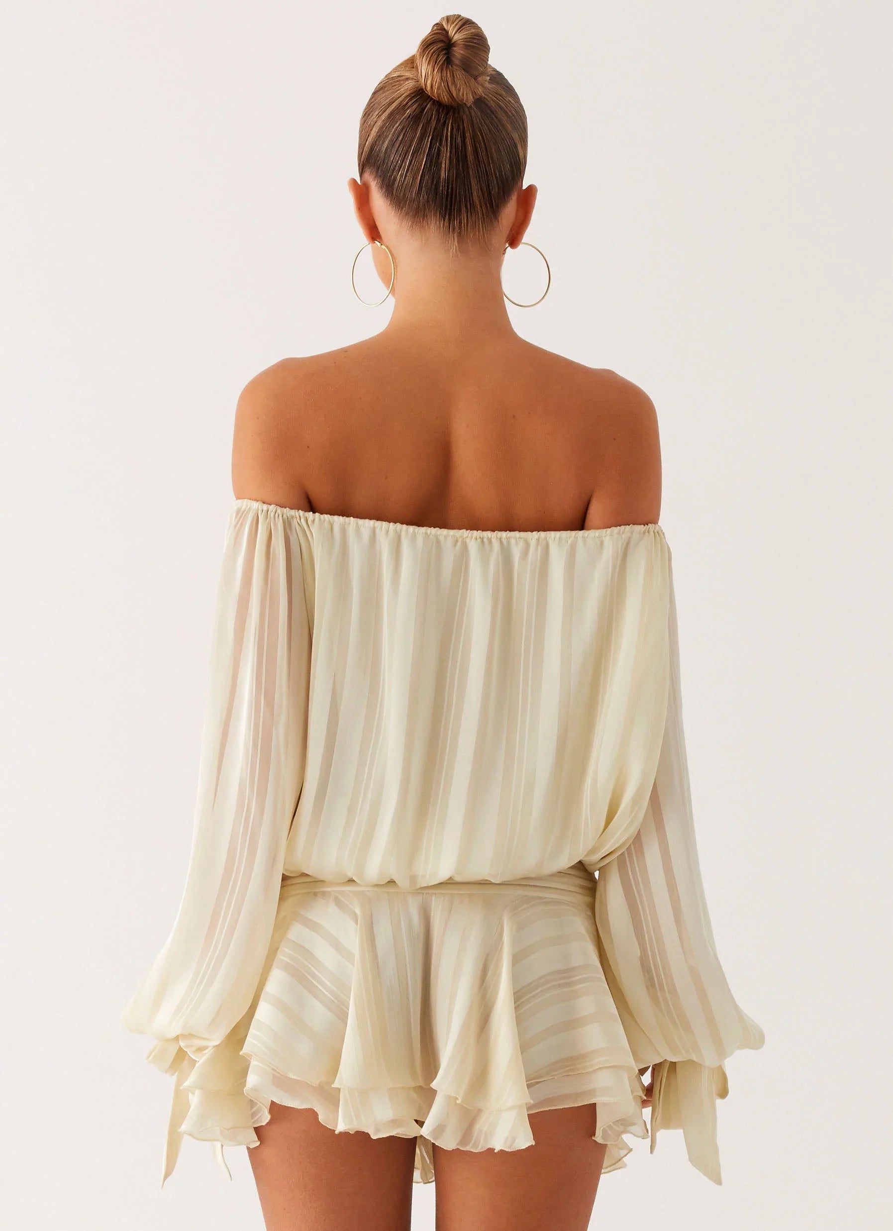 The Eira Balloon Sleeve Mini Dress captures effortless charm with its off-shoulder neckline and elasticated finish for a secure, comfy fit. The frilled hem adds playful movement, while the front tie detail brings a touch of flirty elegance. Perfect for those balmy nights that demand a standout silhouette.