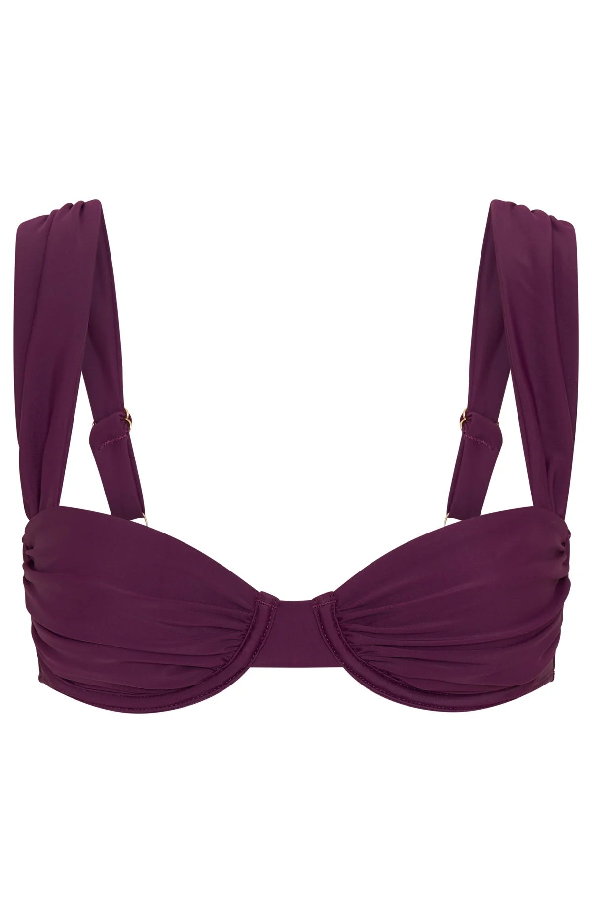 The Elouera Bikini Top Plum pairs perfectly with salty hair and sun-kissed skin. This lined bikini top features thick adjustable straps, underwired bust cups, ruched fabric design and no padding. Pair with the Ocean Views Bottoms Plum for the perfect beach day look.