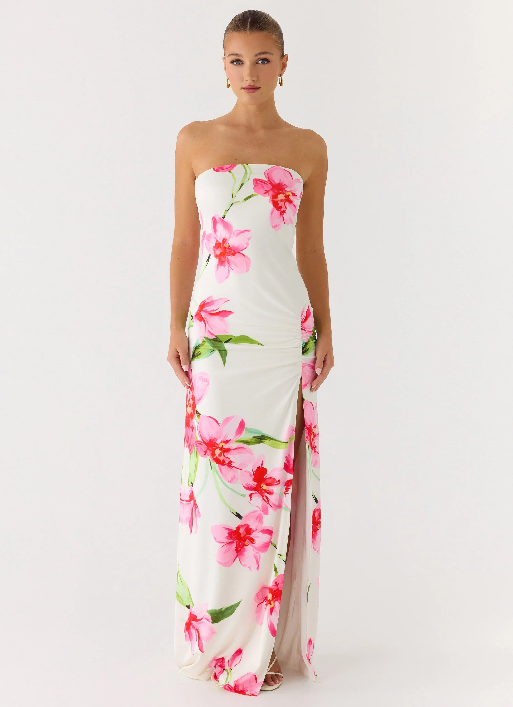 The Erivo Strapless Maxi Dress is made for golden hour moments that flow into late-night elegance. Featuring a strapless neckline with silicone elastic for a secure fit, this maxi-length silhouette boasts a front slit and a sleek stretch jersey finish. Crafted in an exclusive print, it moves effortlessly with every step under sunset skies.
