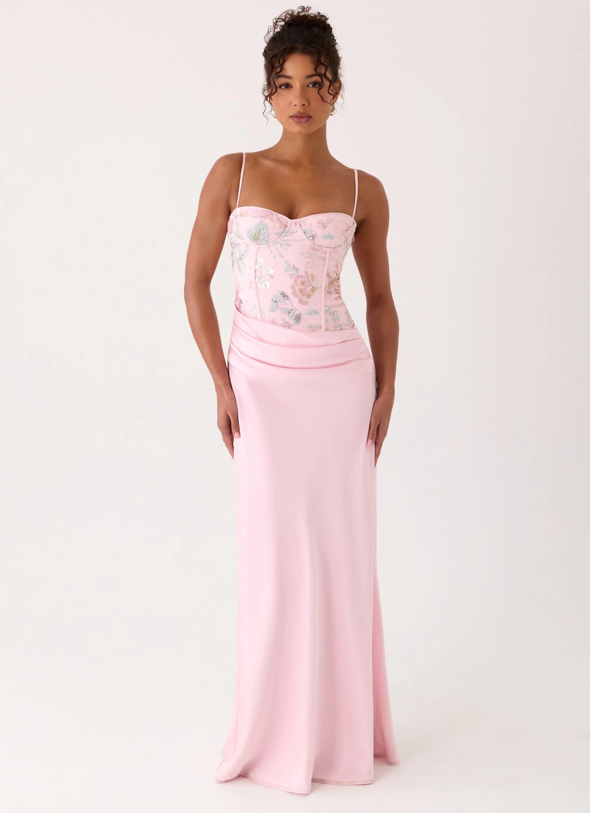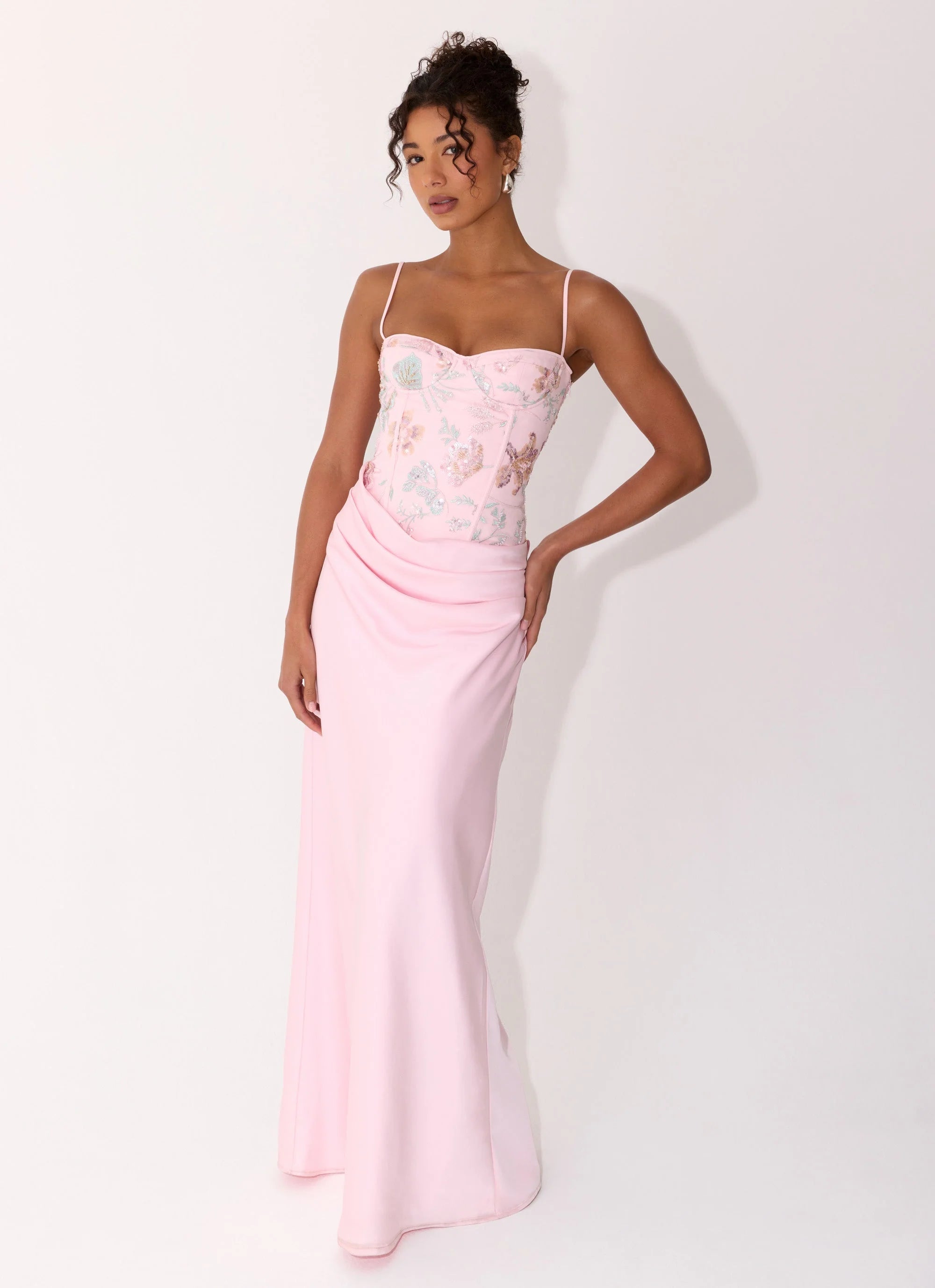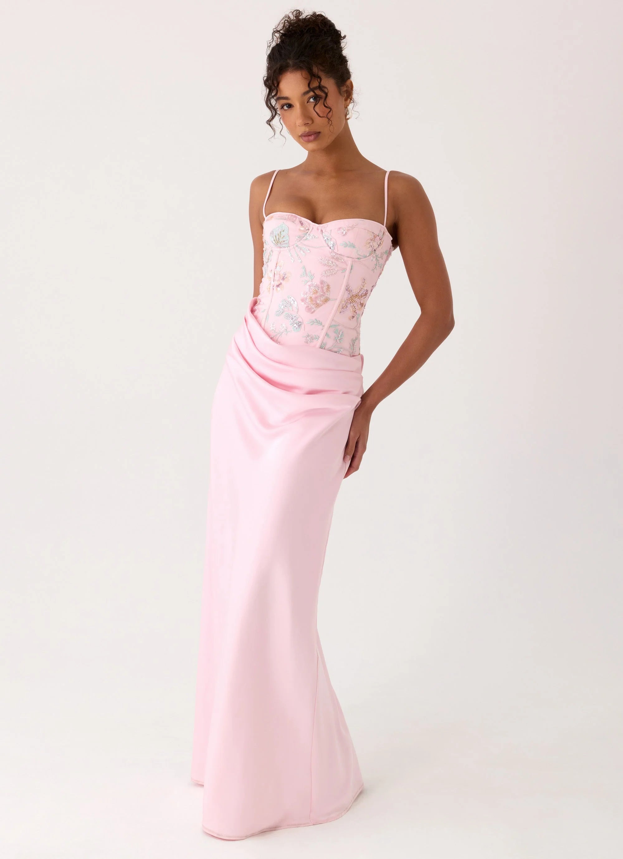 The Euphoric Beaded Maxi Dress is crafted for nights that sparkle long past sunset. With sculpted bust cups and a corset‑style bodice with boning, this silhouette cinches the waist before falling into a draped bias‑cut maxi that catches the light with every step. Fully lined in beaded fabric and finished with an invisible side zipper, it’s made for golden hour glamour and unforgettable evenings.