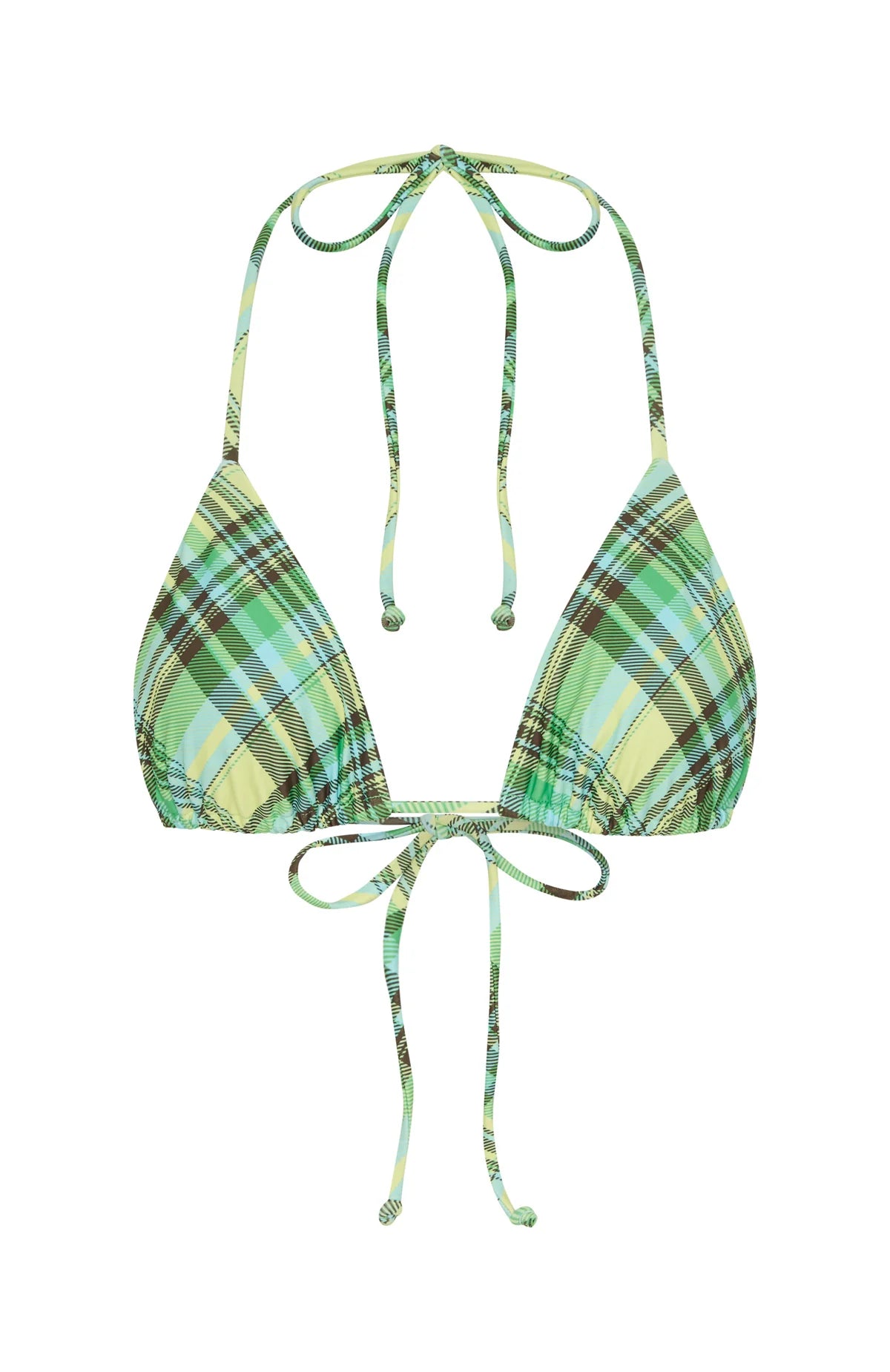 The Golden Hour Bikini Top in Citrus Check is an essential for sun drenched days. This triangle bikini top is a halter neck style with thin elasticated straps and removable padding. To compliment the top, pair with one of our Citrus Check Bikini Bottoms for the perfect poolside look!