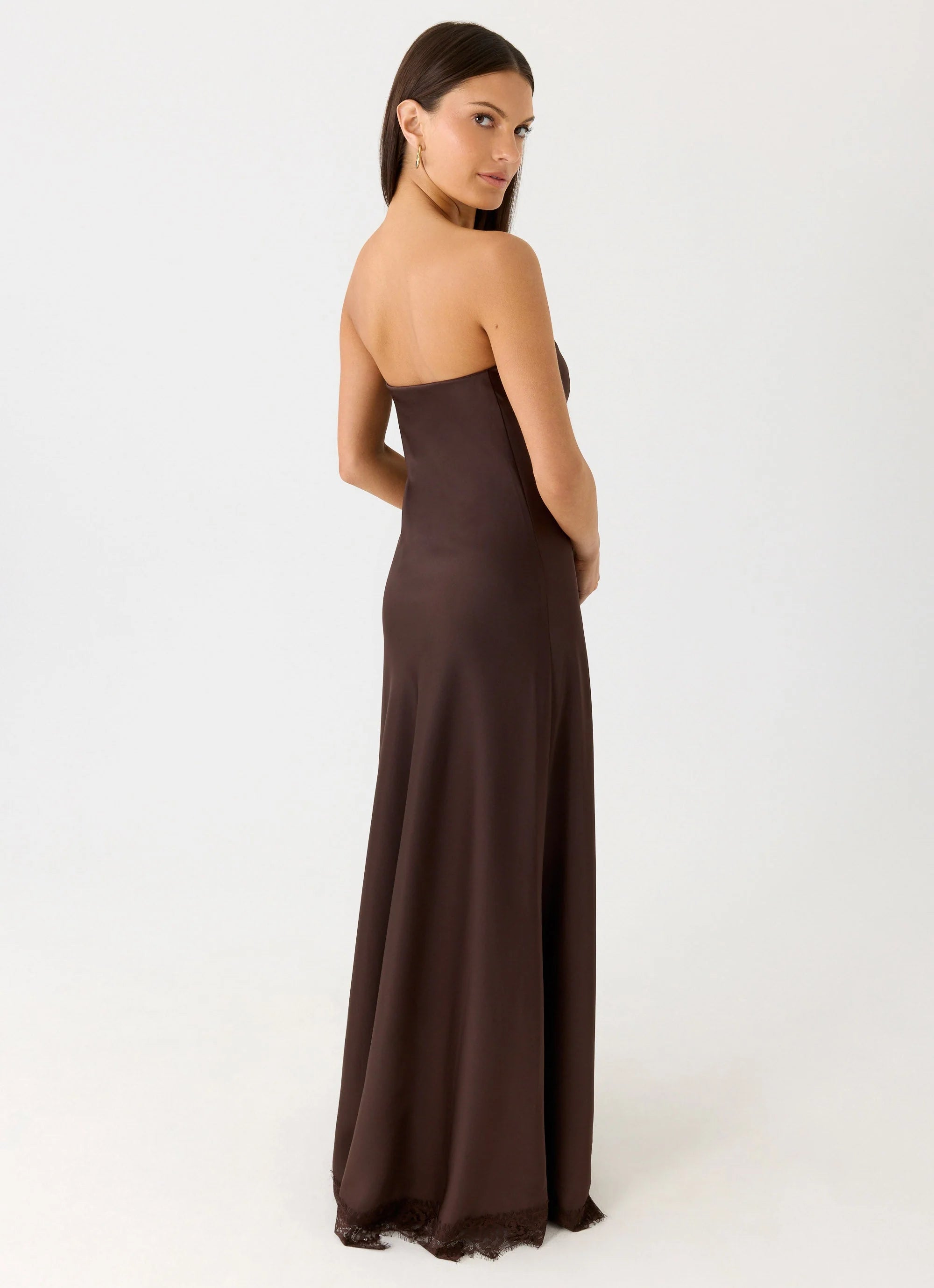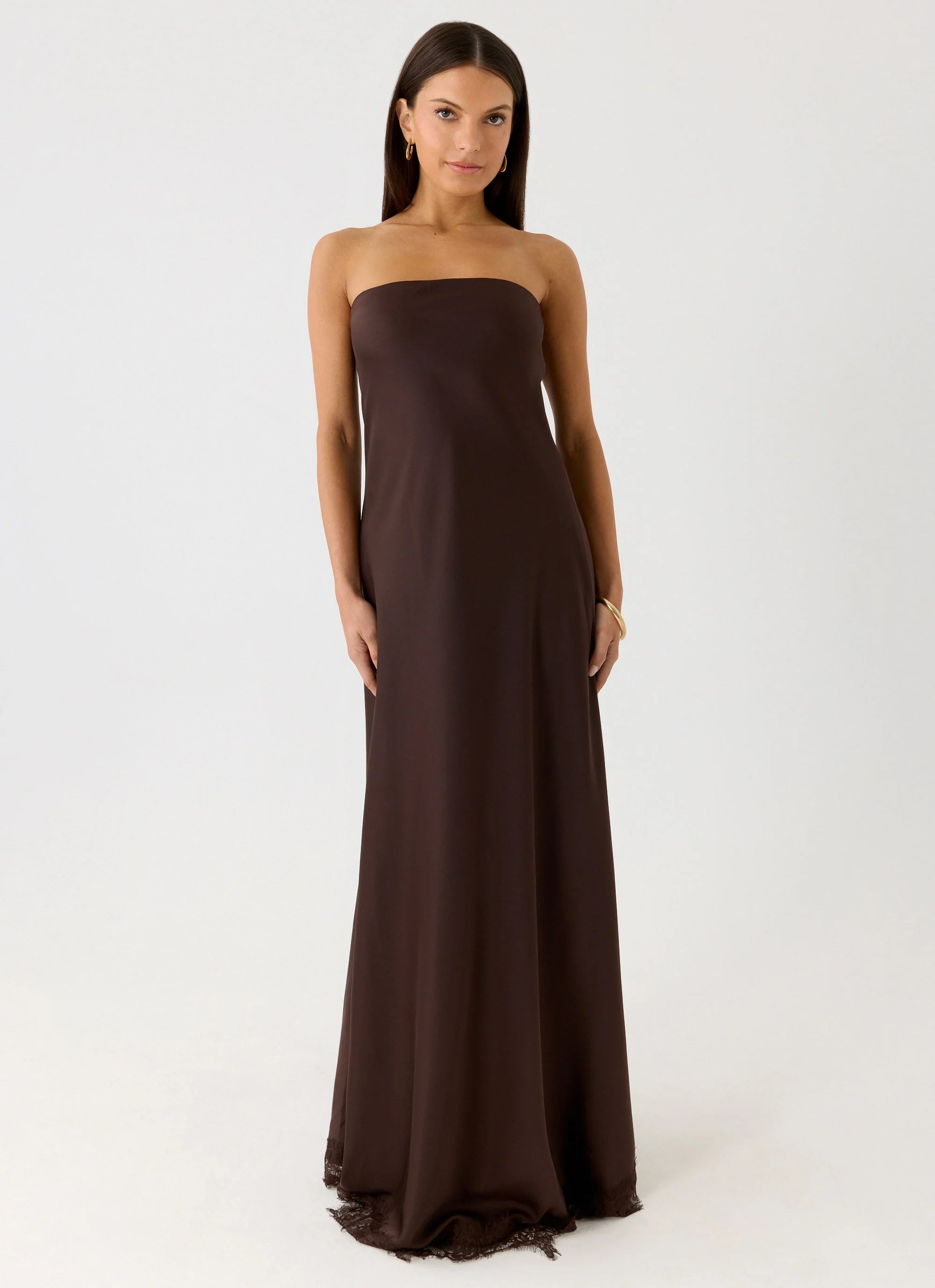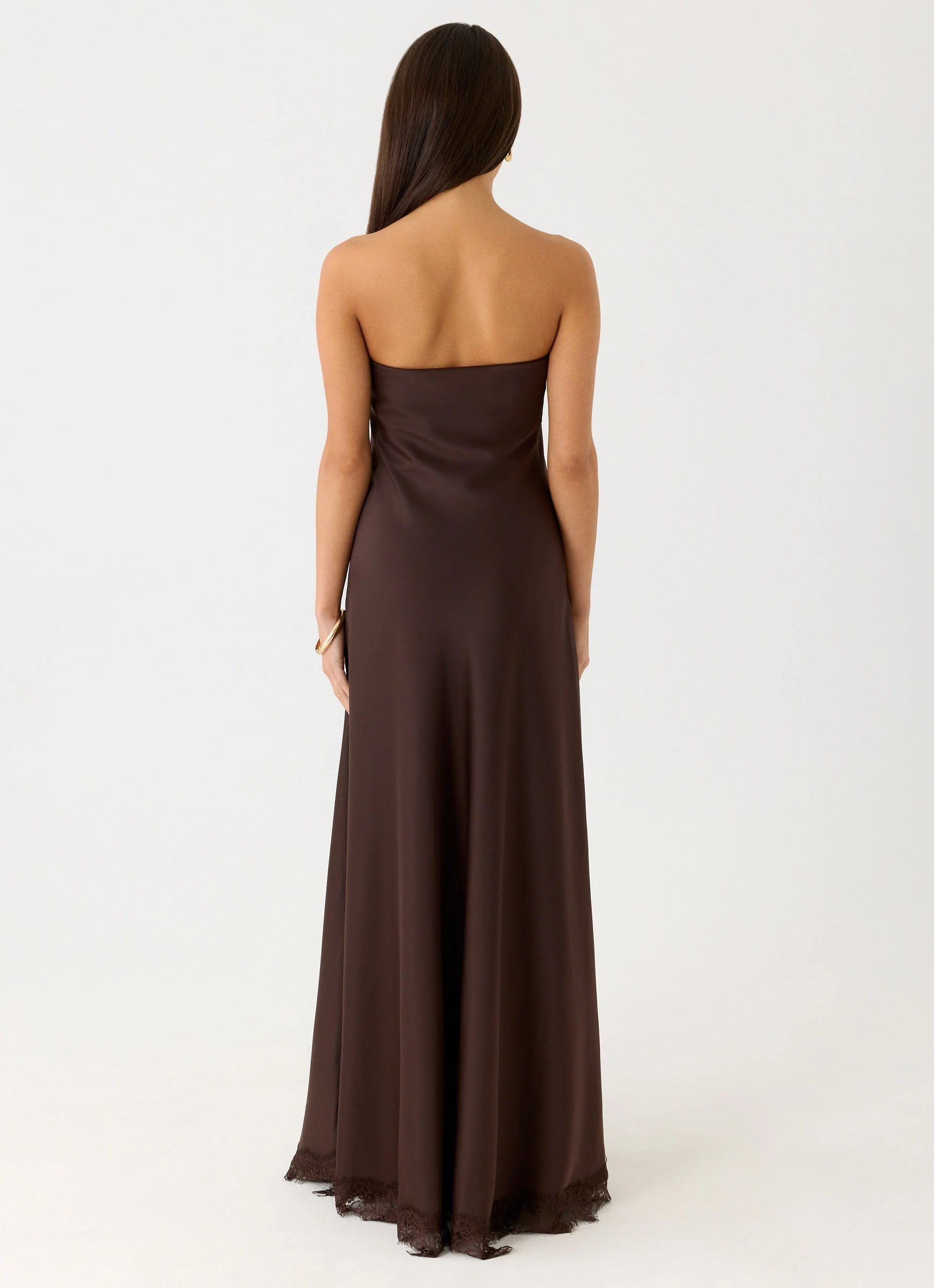 The Kayleigh Strapless Maxi Dress is designed for nights that linger long after sunset. Cut on the bias for a smooth, fluid drape, this strapless silhouette skims the body with effortless ease. Finished with a delicate lace-trim hem, it feels refined yet undeniably after-dark.