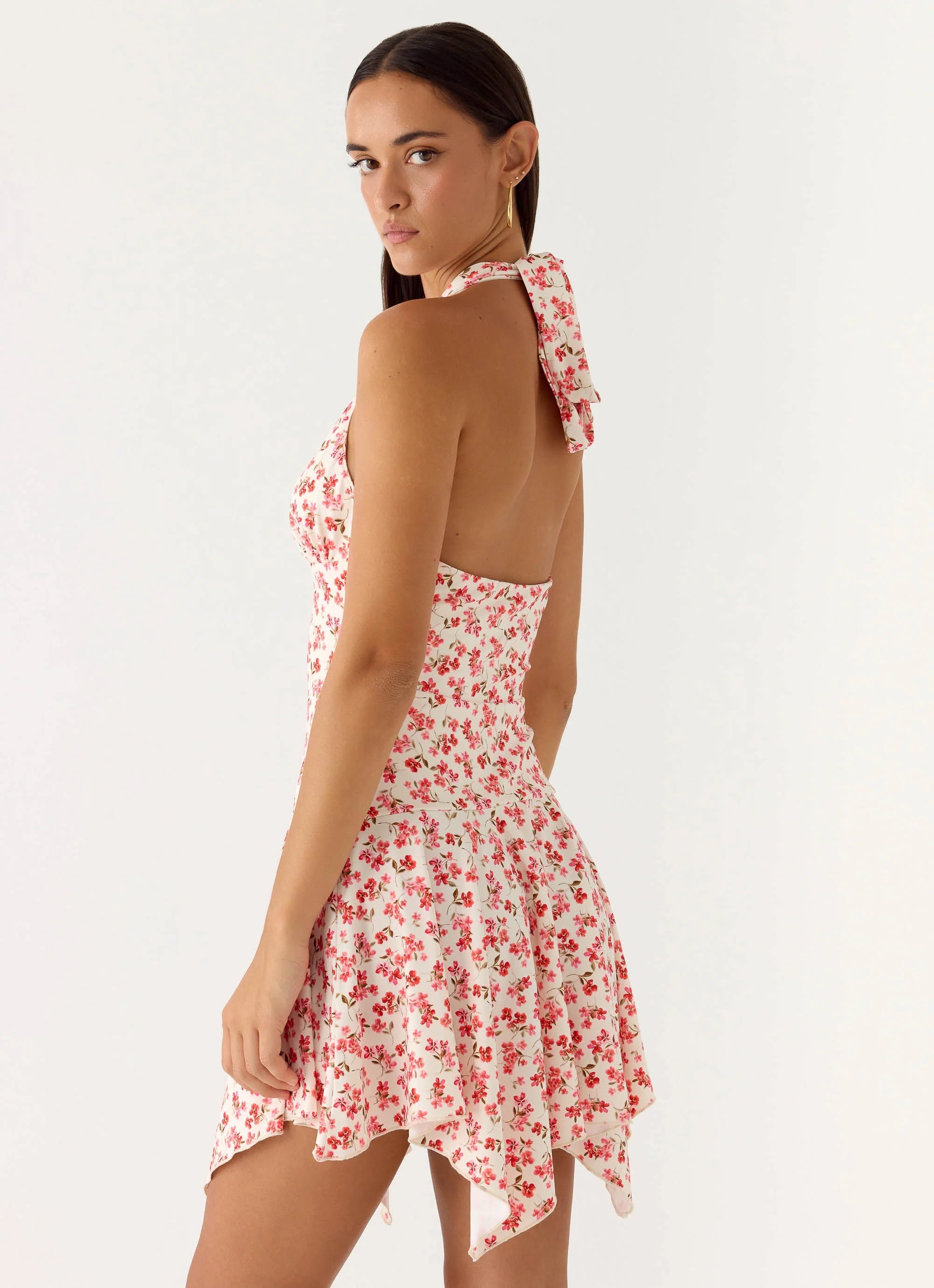 The Khrysta Mini Dress is made for sun-soaked days that glide into golden-hour nights. Featuring a halterneck and asymmetric hanky hem, this mini-length silhouette skims the body in stretch jersey, fully lined for comfort, with scallop detailing adding a playful, editorial edge.
