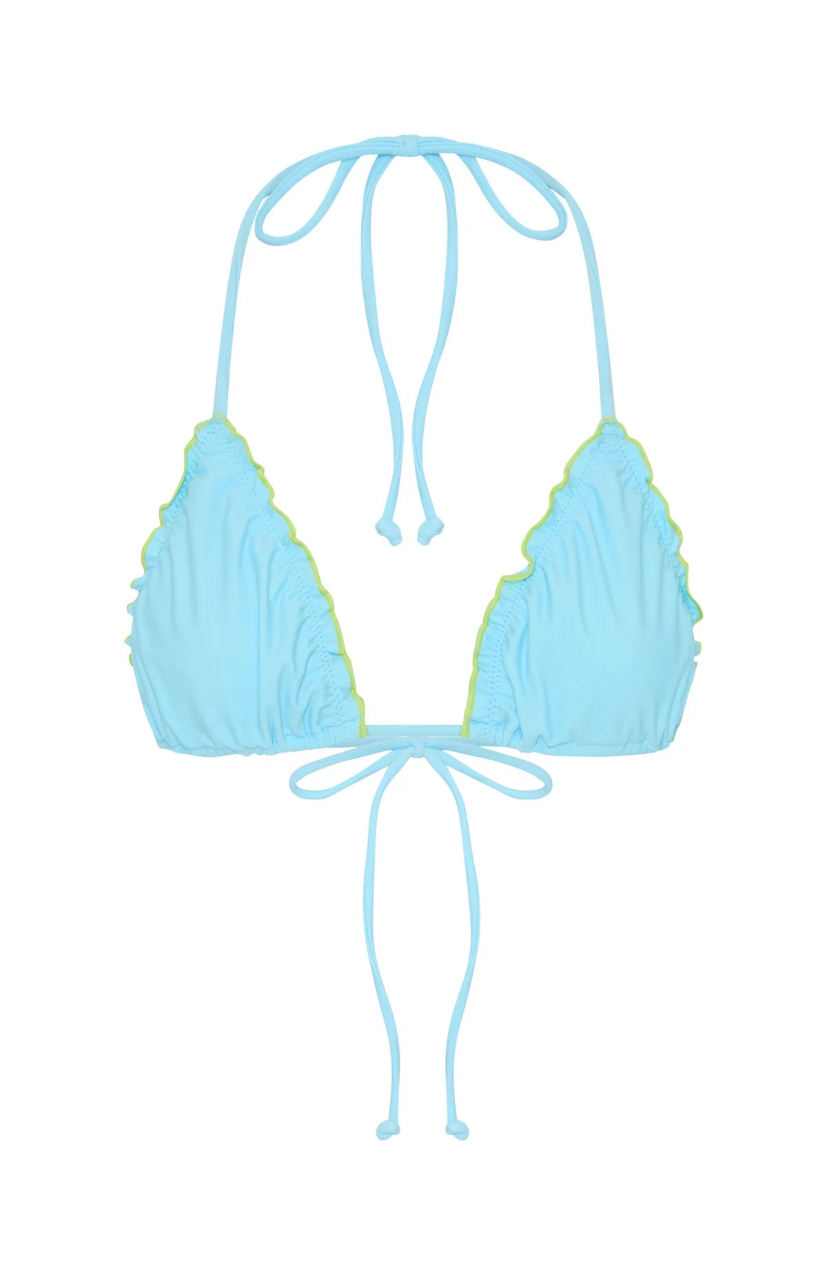 Poolside lounging has never looked cuter in the Kiss The Sun Bikini Top Malibu Blue! Featuring a triangle design, halter neck style with thin elasticated straps, lettuce hem detailing and removable padding. This bikini top can be worn multiple ways. Create a matching moment we adore with any of our swim in Malibu Blue!