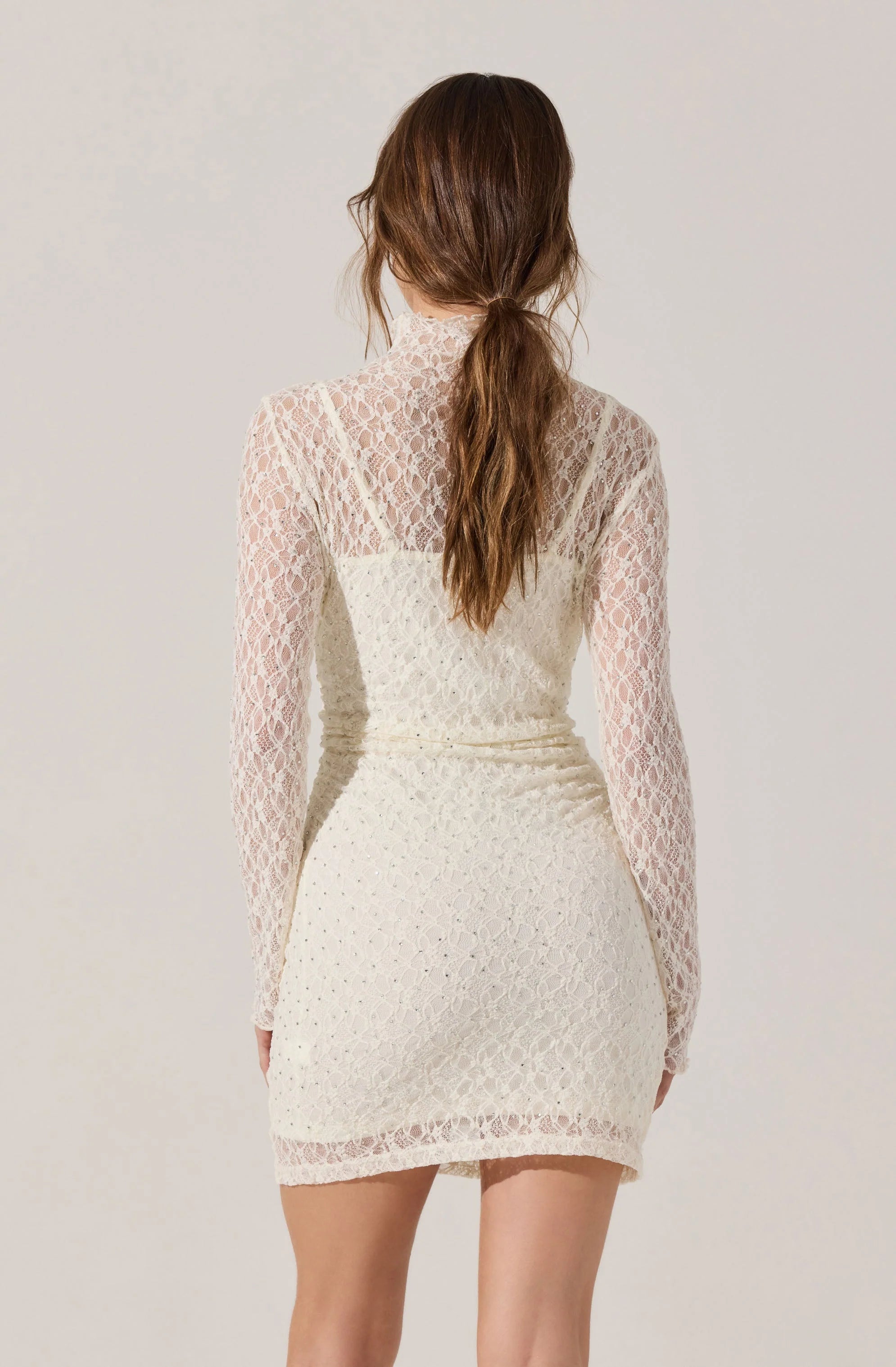 This fitted rhinestone embellished lace mini dress is the ultimate look for cocktail parties, nights out, and every celebration in between.