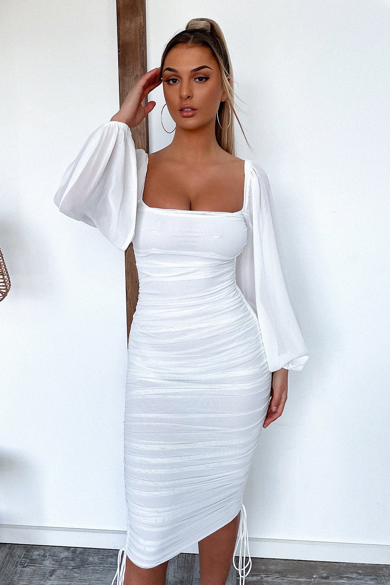 Your fav dress now comes in a MIDI length! She features an all over ruched fabrication with tie up detail on each side of the dress to adjust the length, off the shoulder, sheer long sleeves and is completed with an invisible back zipper. She looks amazing when paired with your go to black heels and silver jewellery.