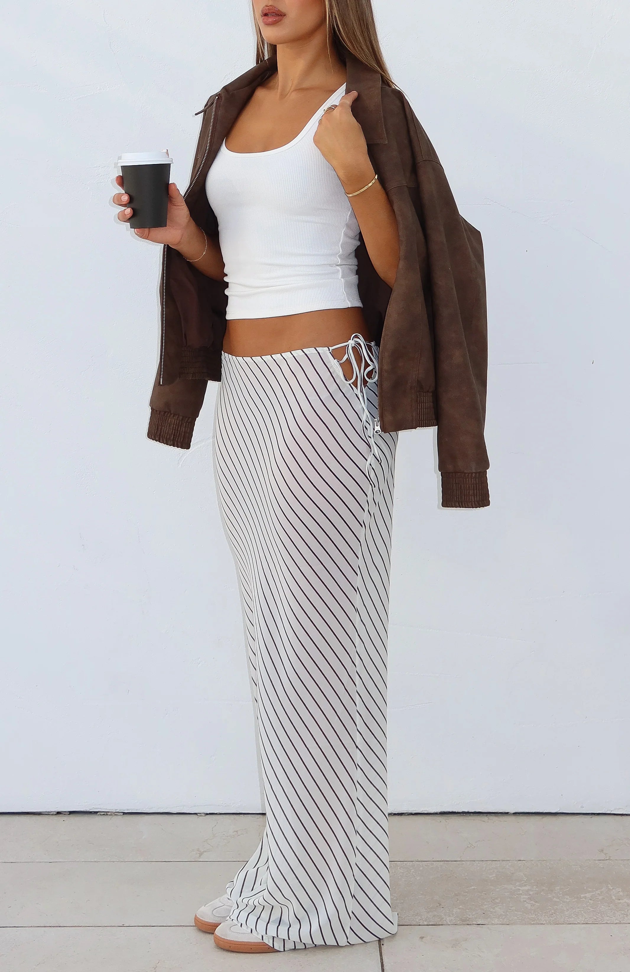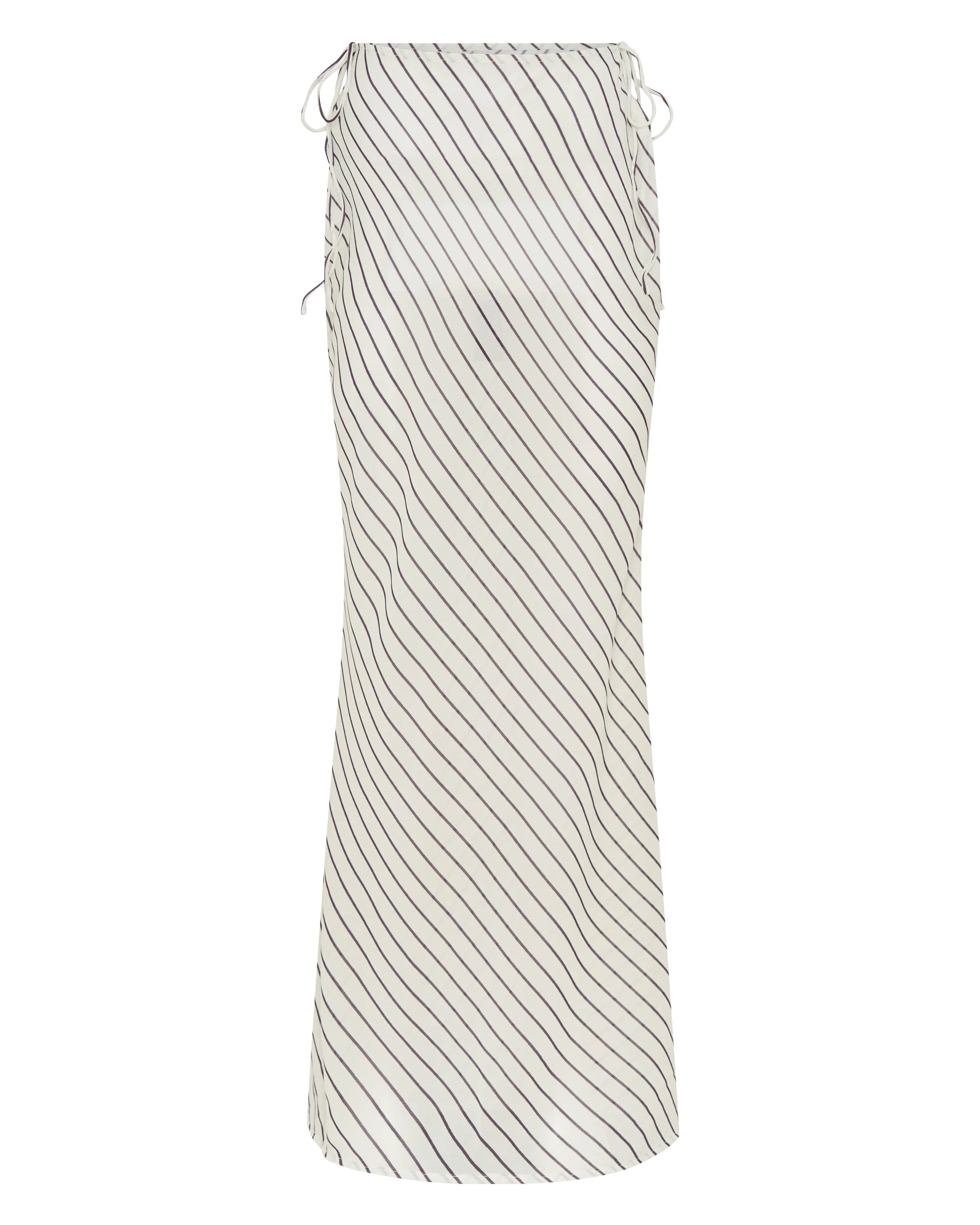 Whether it's cocktail hour under the summer sun or an insta photoshoot, the Luminous Maxi Skirt Cream/Choc Stripe will soon be your go-to. Features a maxi length, cut-out waist design, side self-tie straps, unlined fabric and an easy slip on style. Pair with cool shades and gold accessories for a complete look.
