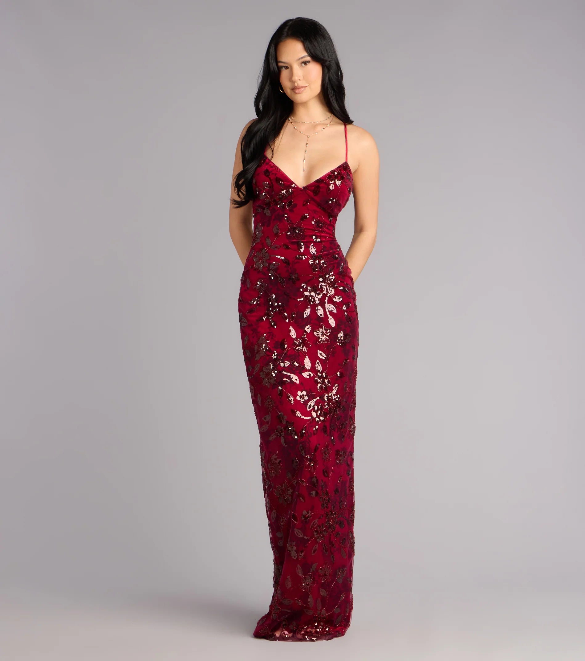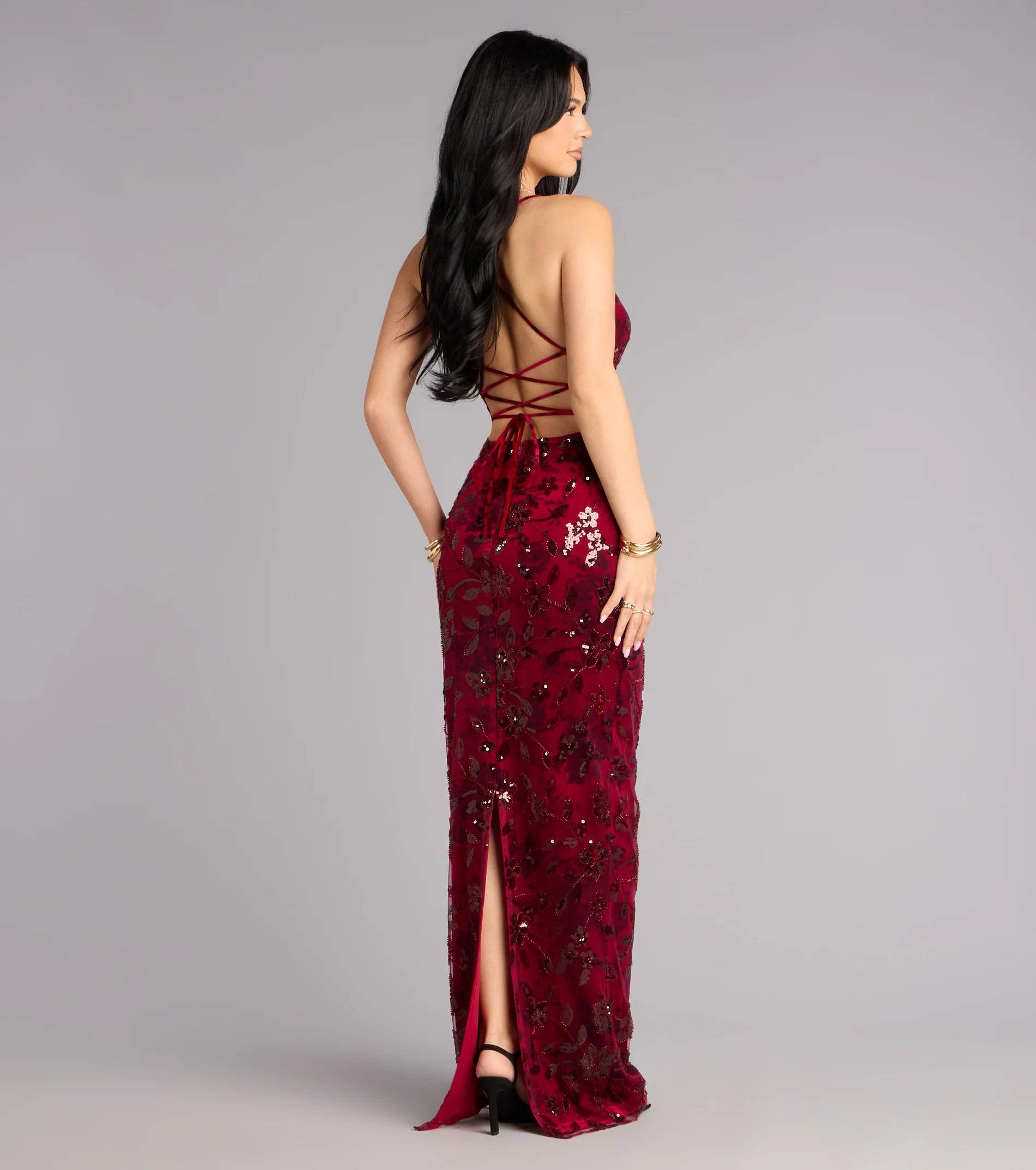 Designed for evenings that call for quiet drama, the Mollie gown moves with a refined, light-catching allure. A V-neckline and lace-up open back frame the silhouette, while the column floor-length hem and center back slit create an elegant finish.