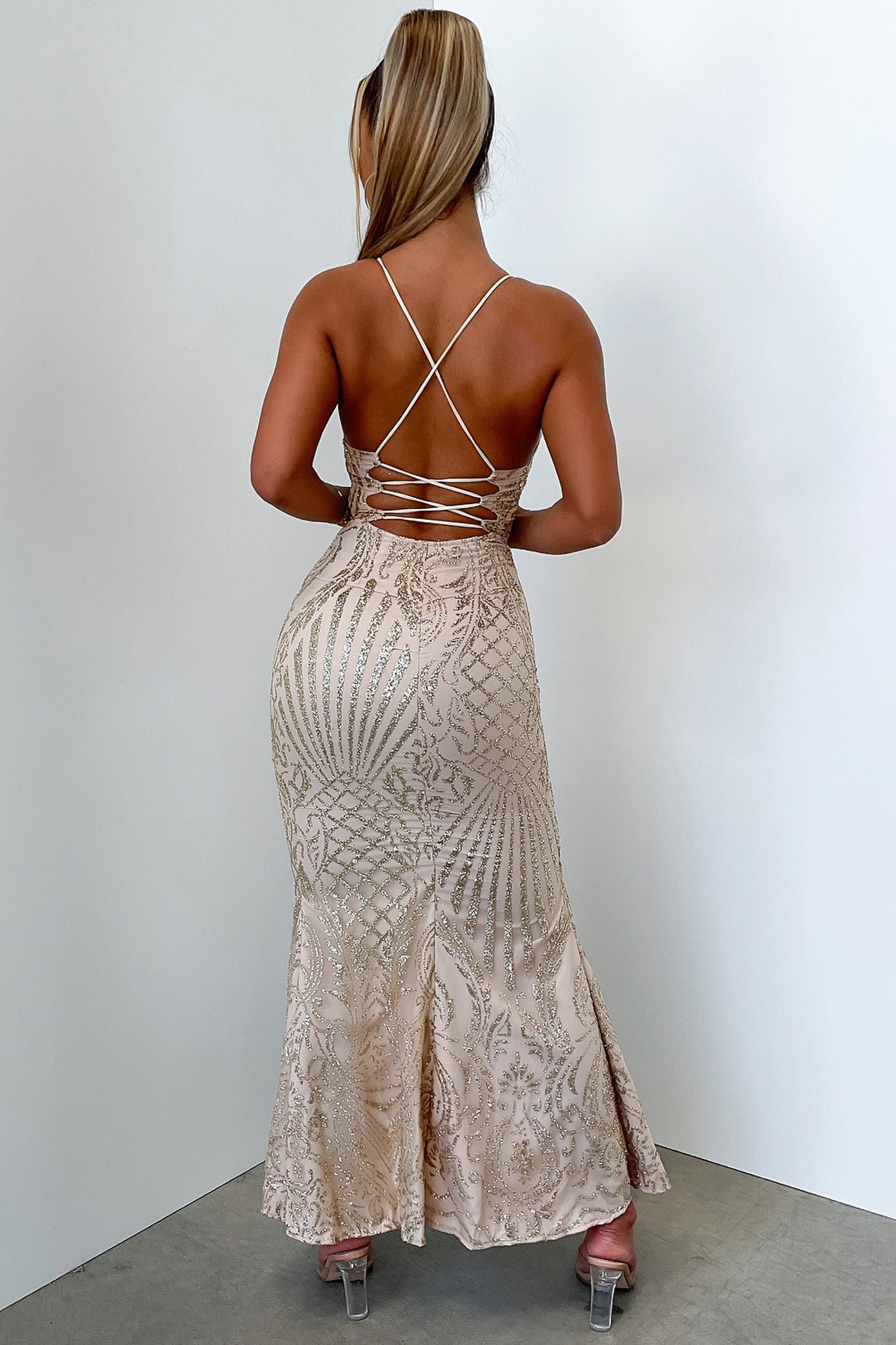 A golden hour goddess in the Narissa Maxi Dress! She a beauty featuring a stunning gold sequin print, a v neckline with shoulder straps continuing onto the back forming a criss cross detail, an invisible side zipper, double lined material with a mesh top layer and a cheeky thigh high slit. Style her with nude stilettos and a full glam face for your next formal outing.