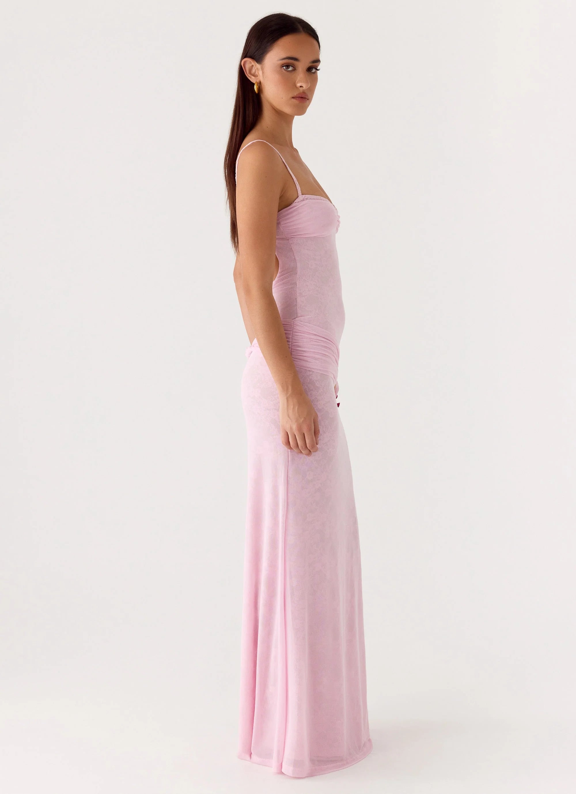 The Natty Lace Mesh Maxi Dress is made for nights that shimmer with romantic elegance. Featuring a sweetheart neckline with adjustable straps and a flowing maxi-length silhouette, it’s adorned with lace detailing, delicate flower embellishments, and a front tie sash for effortless movement. Fully lined in stretch lace, it captures golden hour glamour from day into night.