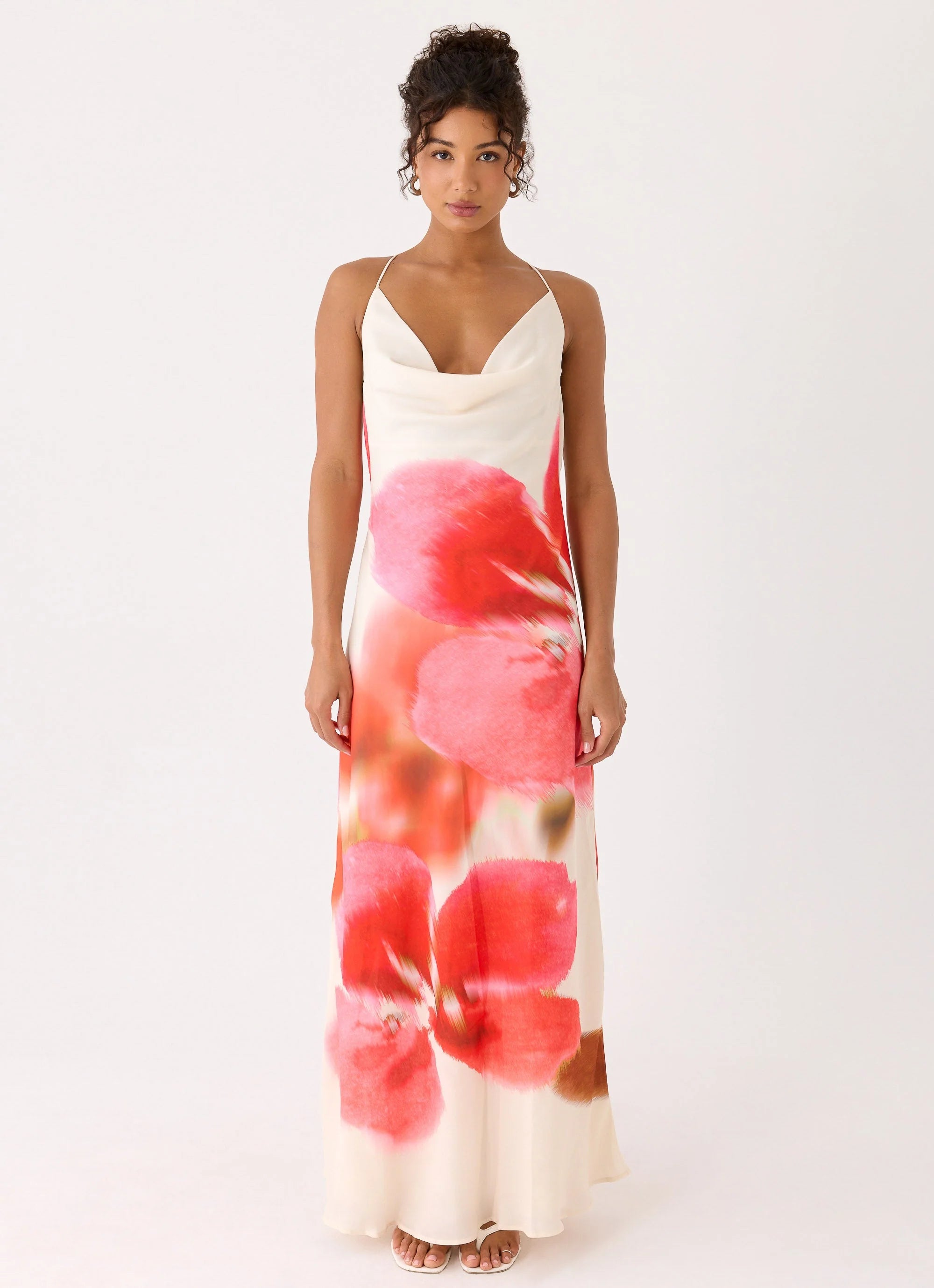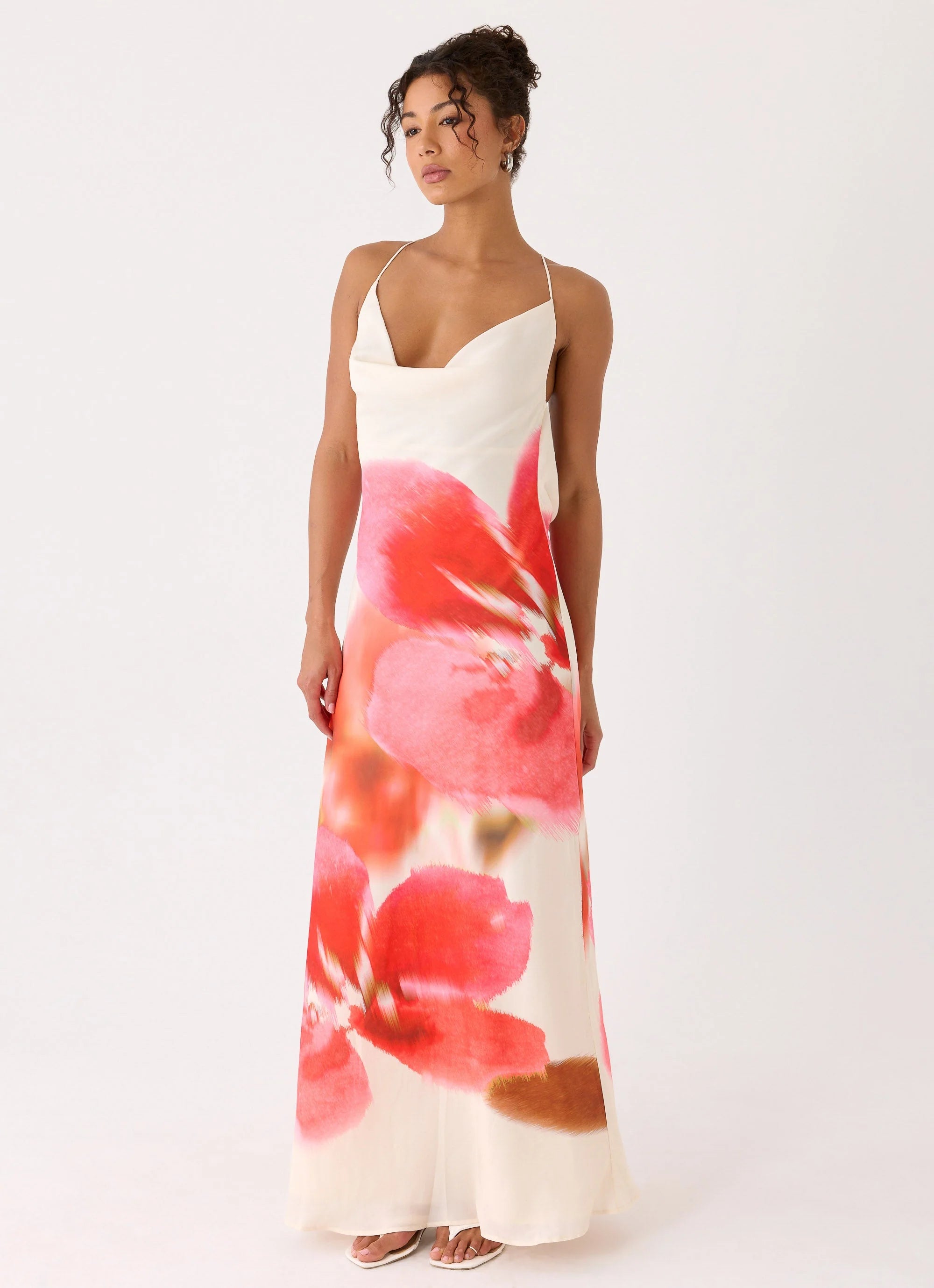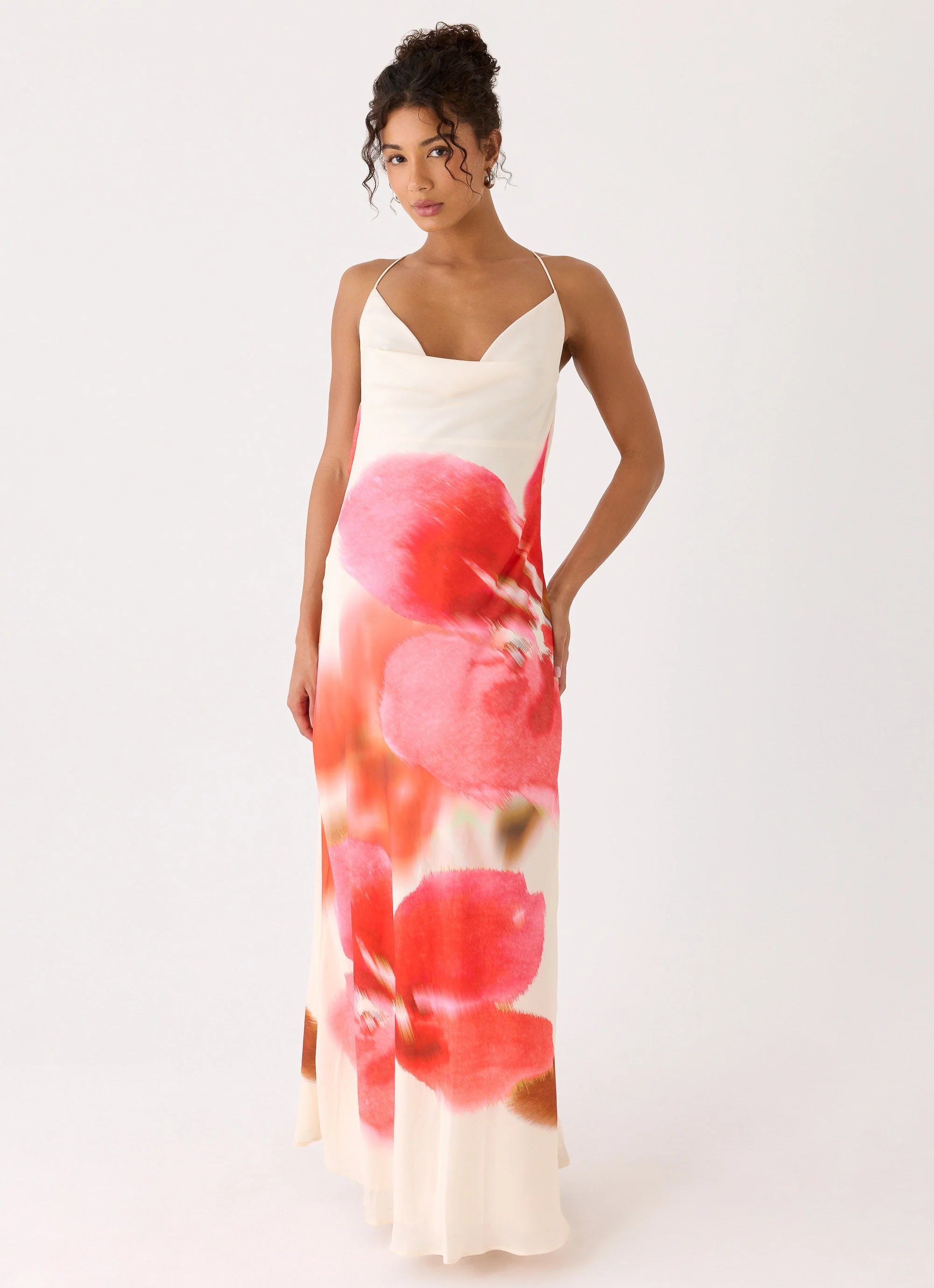 The Samya Cowl Maxi Dress drapes effortlessly from dusk to dancefloor. Cut on the bias in airy chiffon, it skims the body with a relaxed silhouette and falls to a sweeping maxi length. A low cowl neckline and striking crossback straps frame the form, while the placement print adds an artful, after-dark allure.