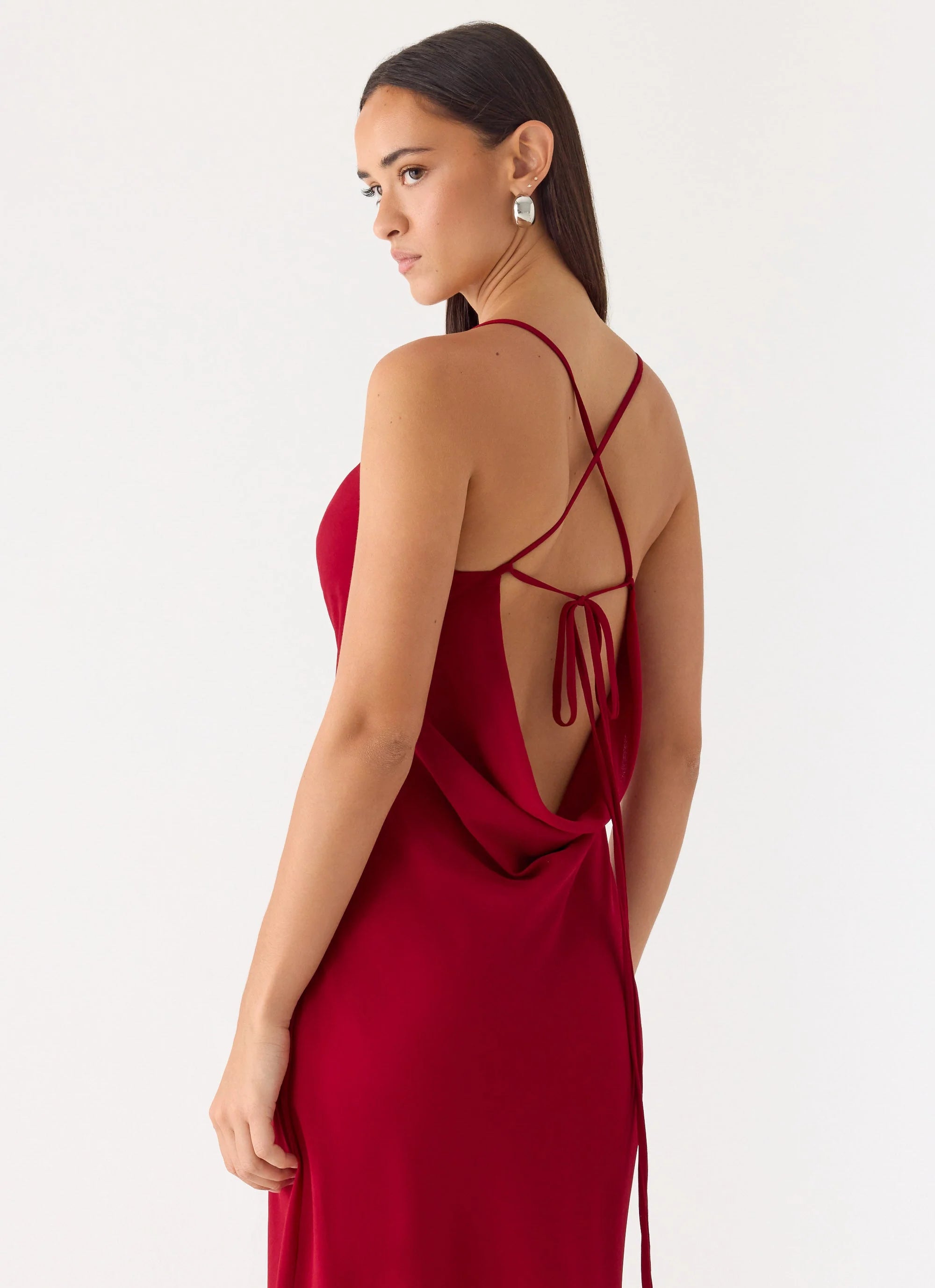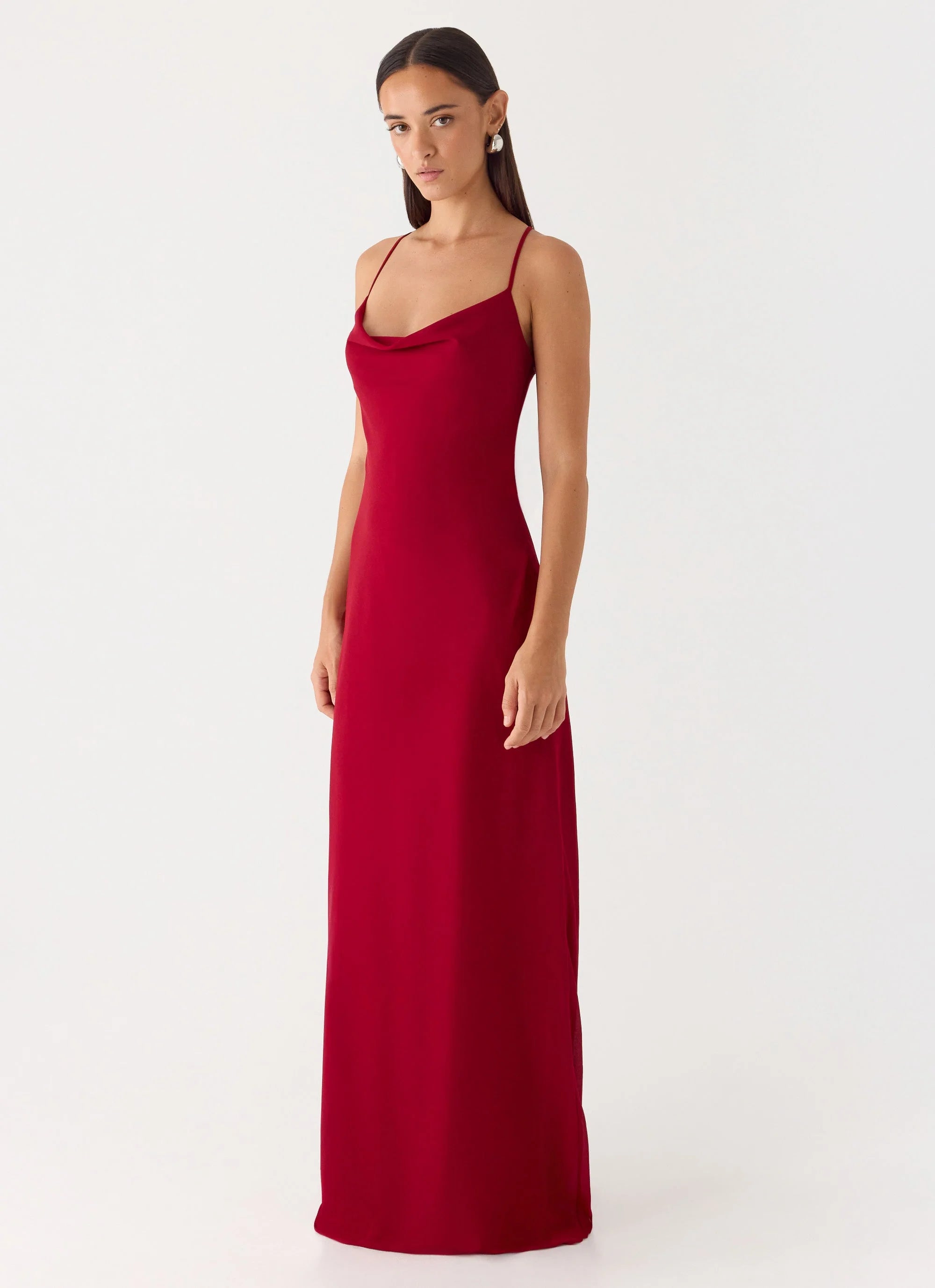 The Saria Maxi Dress is a bold, flowing silhouette designed to make an impression. With a halter cowl neckline, thin adjustable straps, and a flattering bias cut, it hugs the body while allowing effortless movement. Fully lined for comfort, this maxi-length dress is made for golden-hour moments that last into the night.