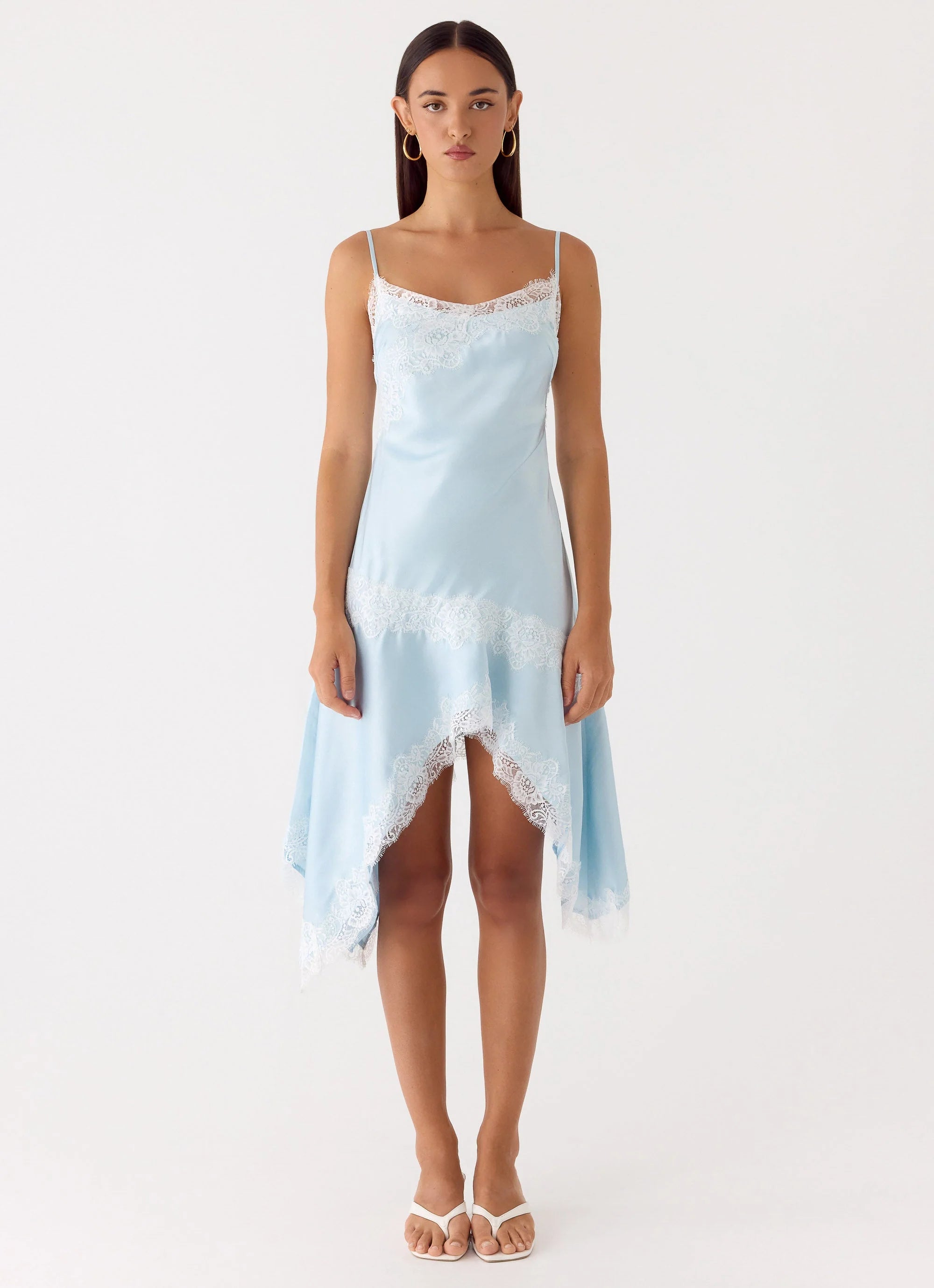 The Starla Midi Dress is made for moments that shimmer from sunset into night. Featuring adjustable spaghetti straps and a bias-cut silhouette, it skims the body with effortless elegance. Lace trim and an asymmetric hemline add subtle, feminine detail, while the fully lined design ensures comfort and a flawless fit.