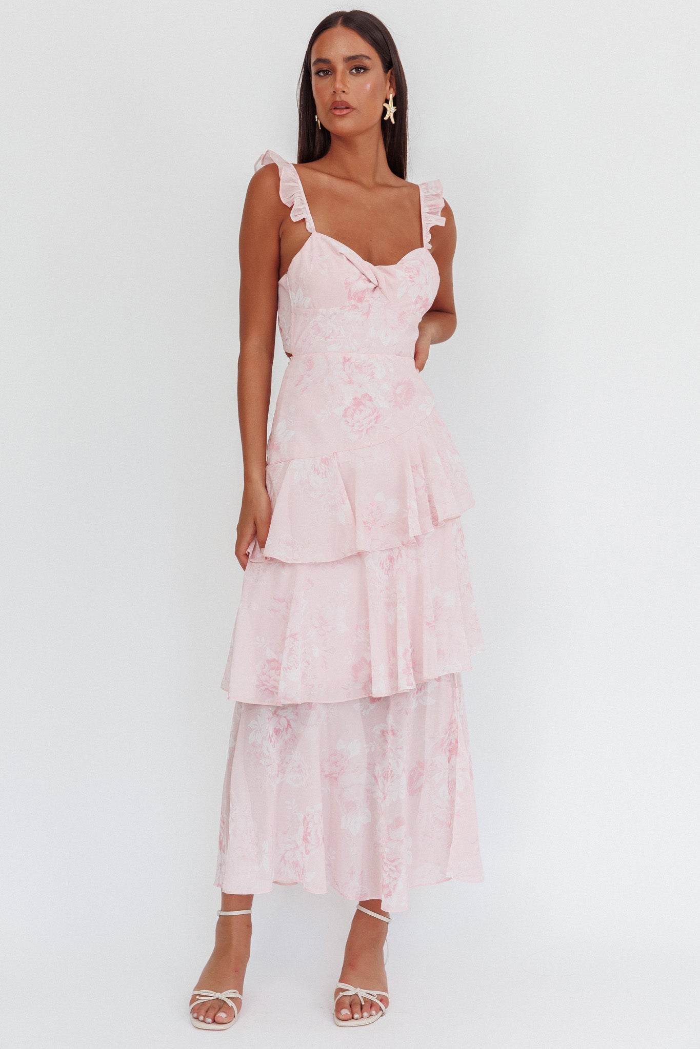 Jaws will drop when you float by in our gorgeous Veda dress. Its pretty, tiered ruffles and ruffle straps make it fit for a princess! Perfect for a special birthday celebration teamed with heels and a clutch for a dreamy look.