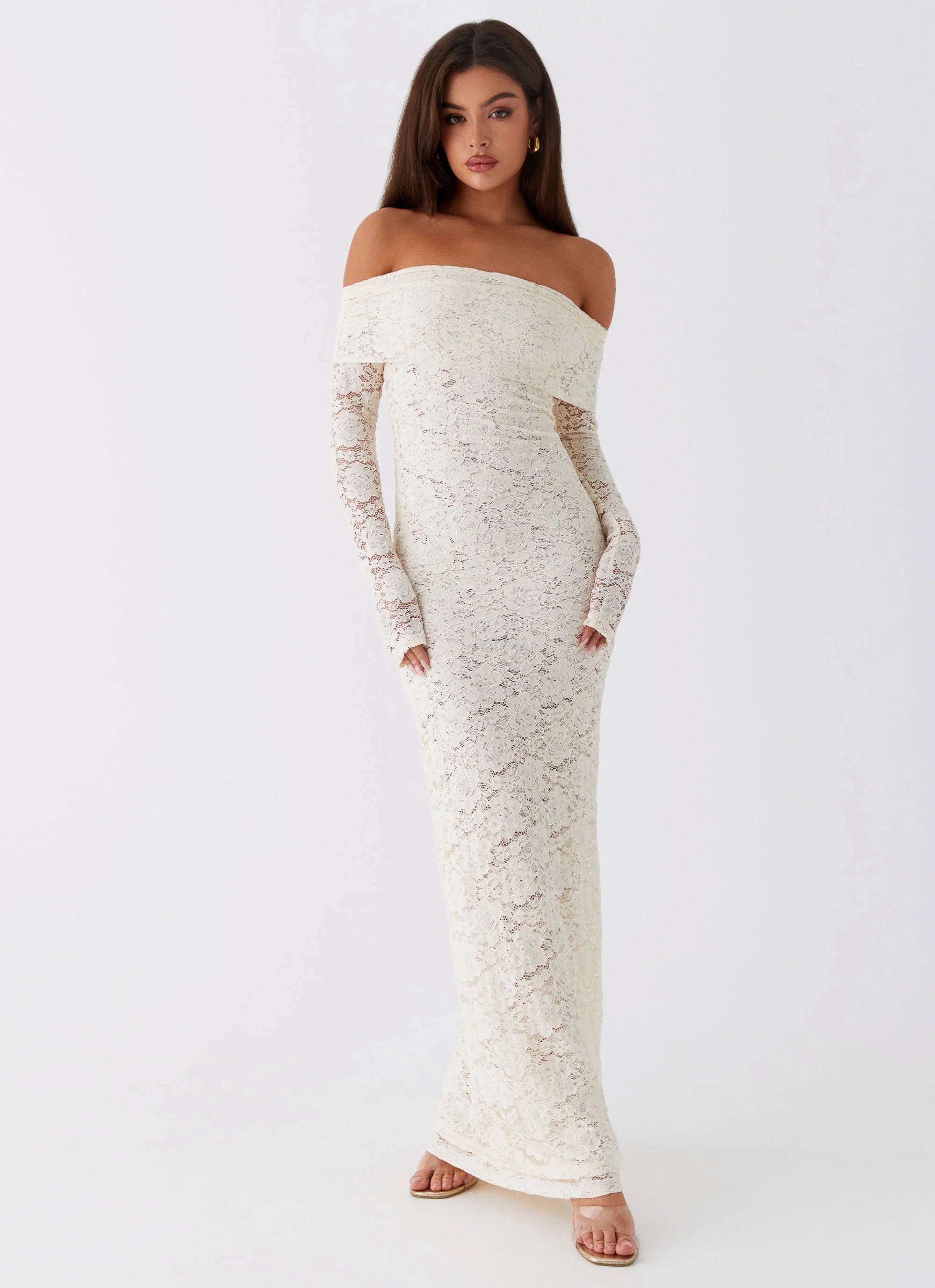 Embrace timeless romance with the Yours Always Lace Maxi Dress. Featuring elegant long sleeves and a semi-sheer lace fabric that exudes sophistication, this dress is designed with an off-the-shoulder neckline for a touch of allure. Perfect for those who cherish classic beauty with a modern twist.
