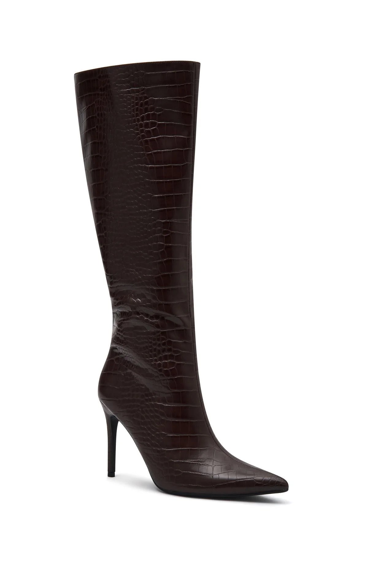 Make your dreams come true with the Ziggy Knee High Boots Chocolate Croc! Featuring a statement heel, a pointed toe-shape, croc fabrication and an inner zip to easily slip on and go. Pair with your layering essentials to keep warm with these cooler months.
